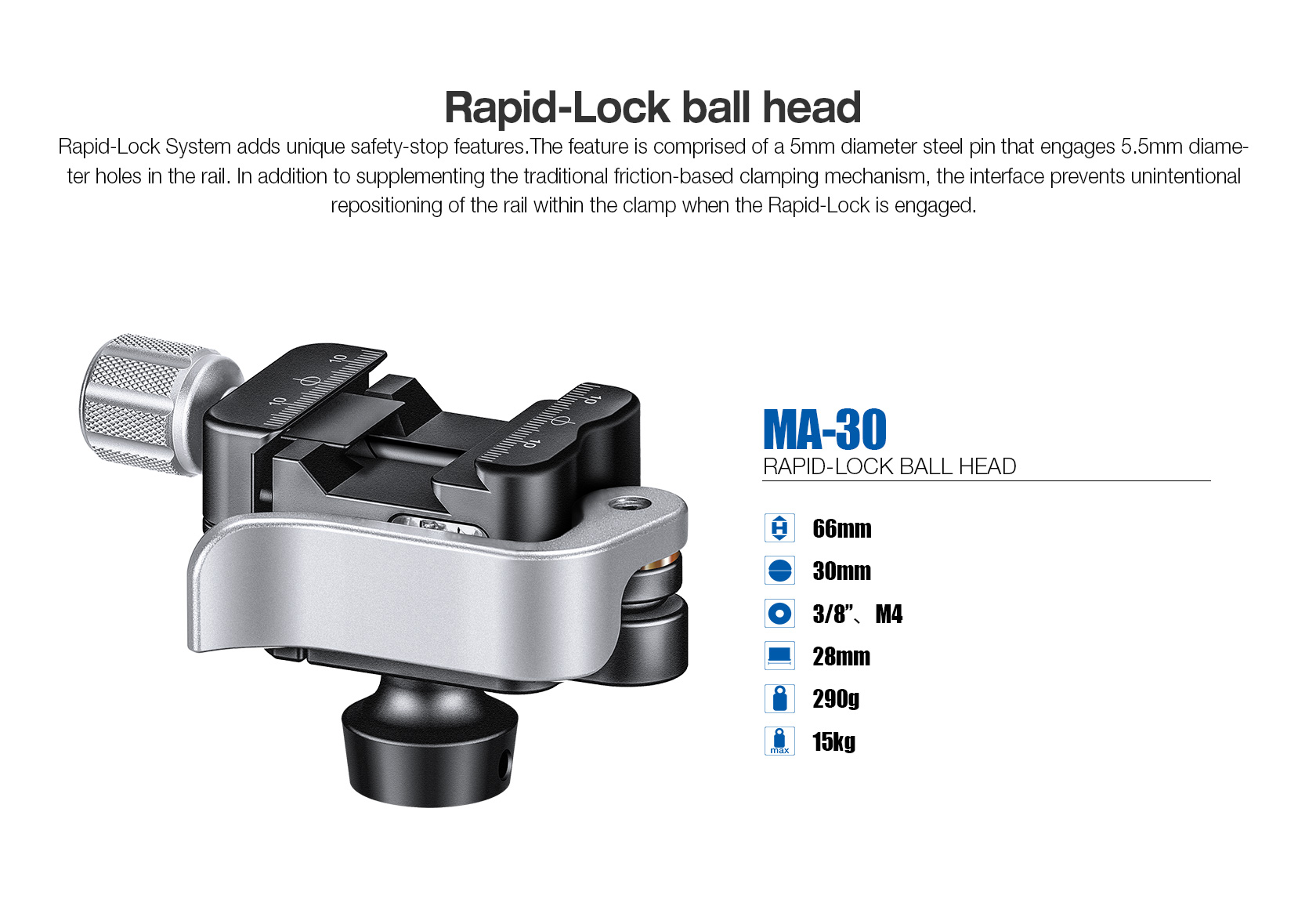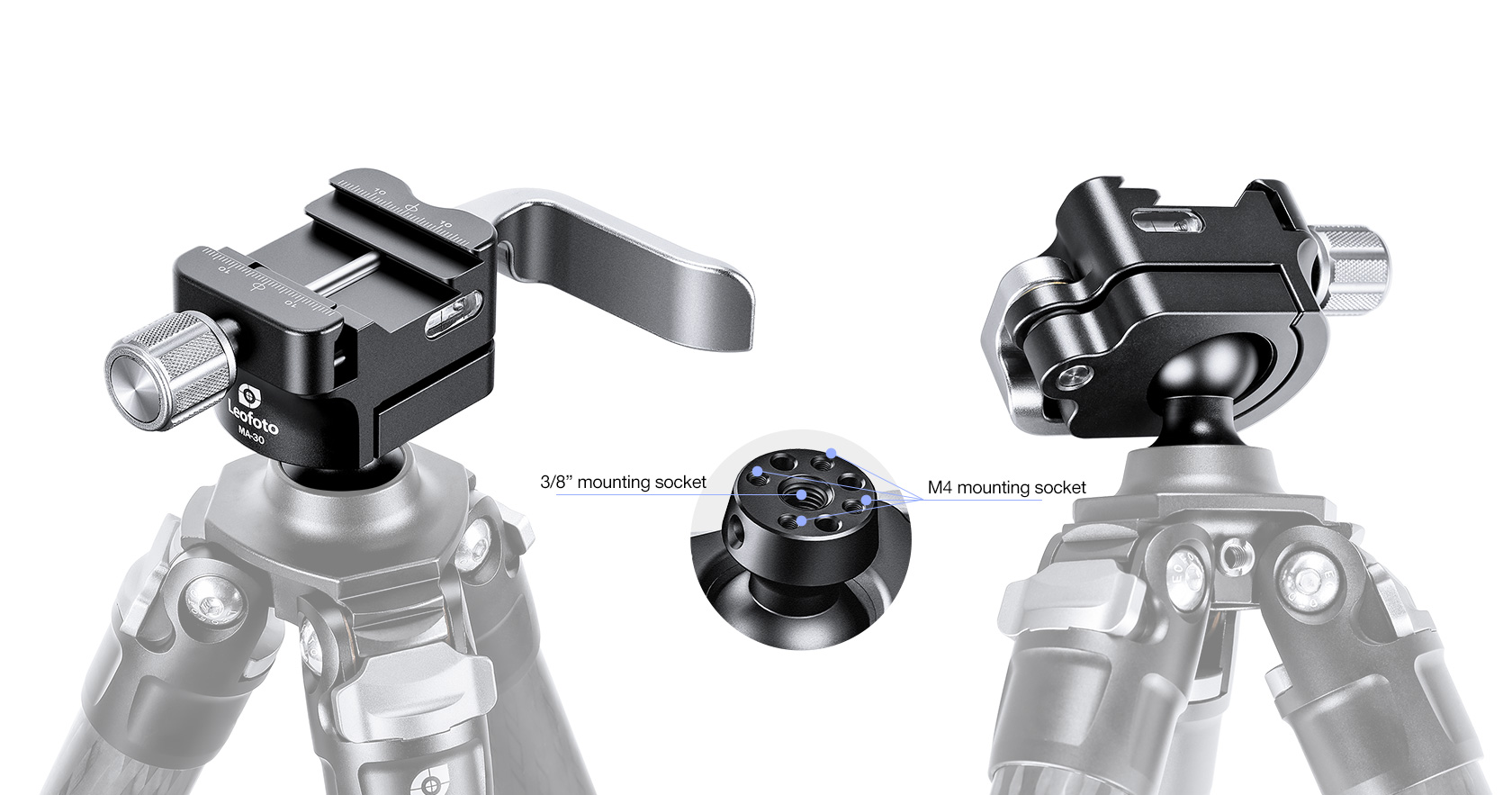 The Leofoto MA-30 Lever-Release Rapid Lock Ball Head was designed specifically to be used on an SA series tripod. The head has a lever release to lock/unlock the ball and a redesigned lever-release clamp system with an adjustable clamping width.