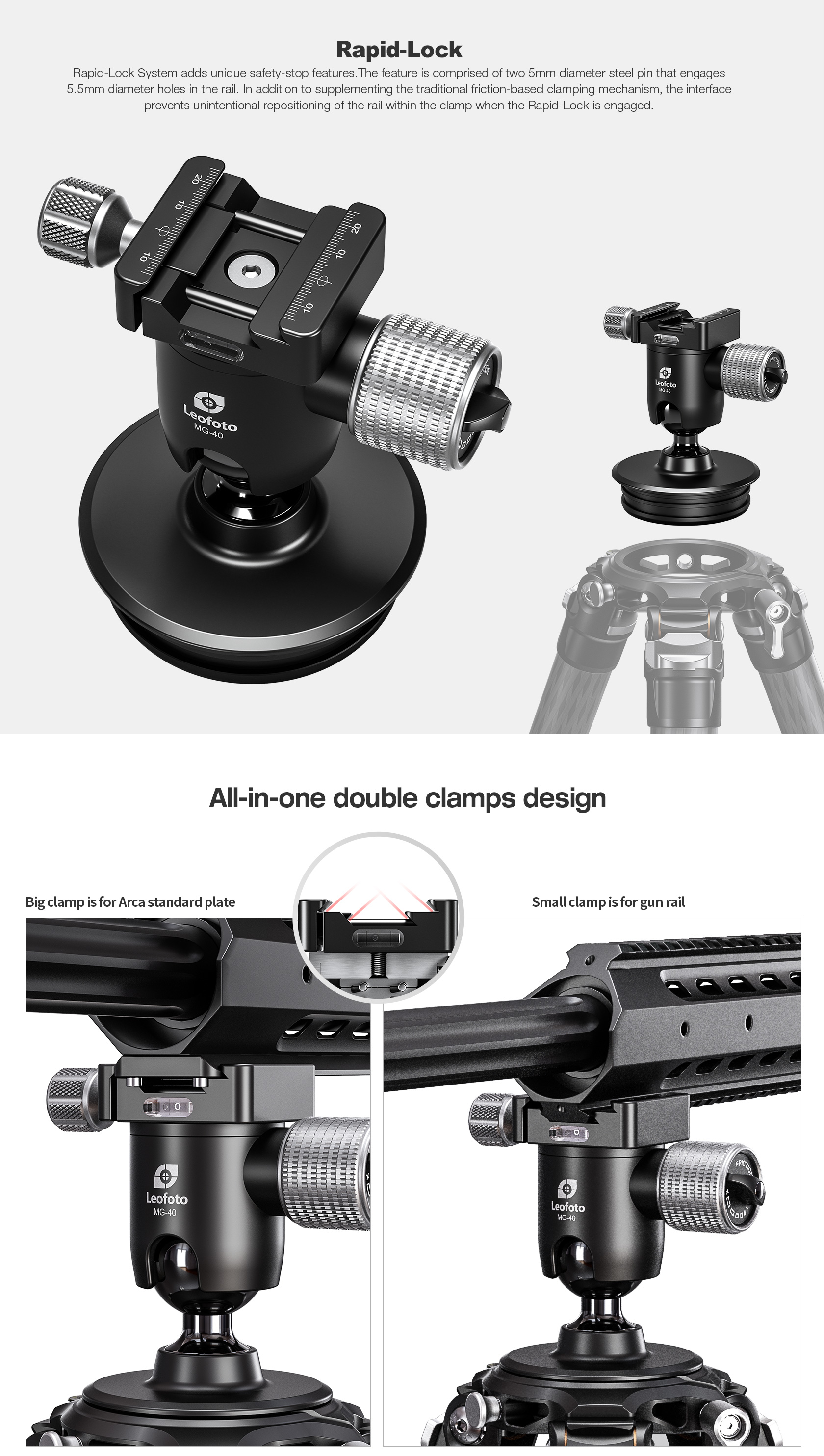 The Leofoto MAB-100G Precision Rifle Ball Head with 100mm Systematic Adapter is machined from solid aircraft grade aluminum and hard anodized for the optimal strength and durability. The MAB-100G is designed to be used with 100mm compatible systematic tripod apexes. It features a redesigned lever-release arca clamp as well as a lever controlled ball. The redesigned clamp comes with an adjustable clamping width. The MAB-100G is essentially an MG-40 ball head attached to a 100mm adapter.. The systematic adapter can only be placed into a 100mm systematic tripod apex.