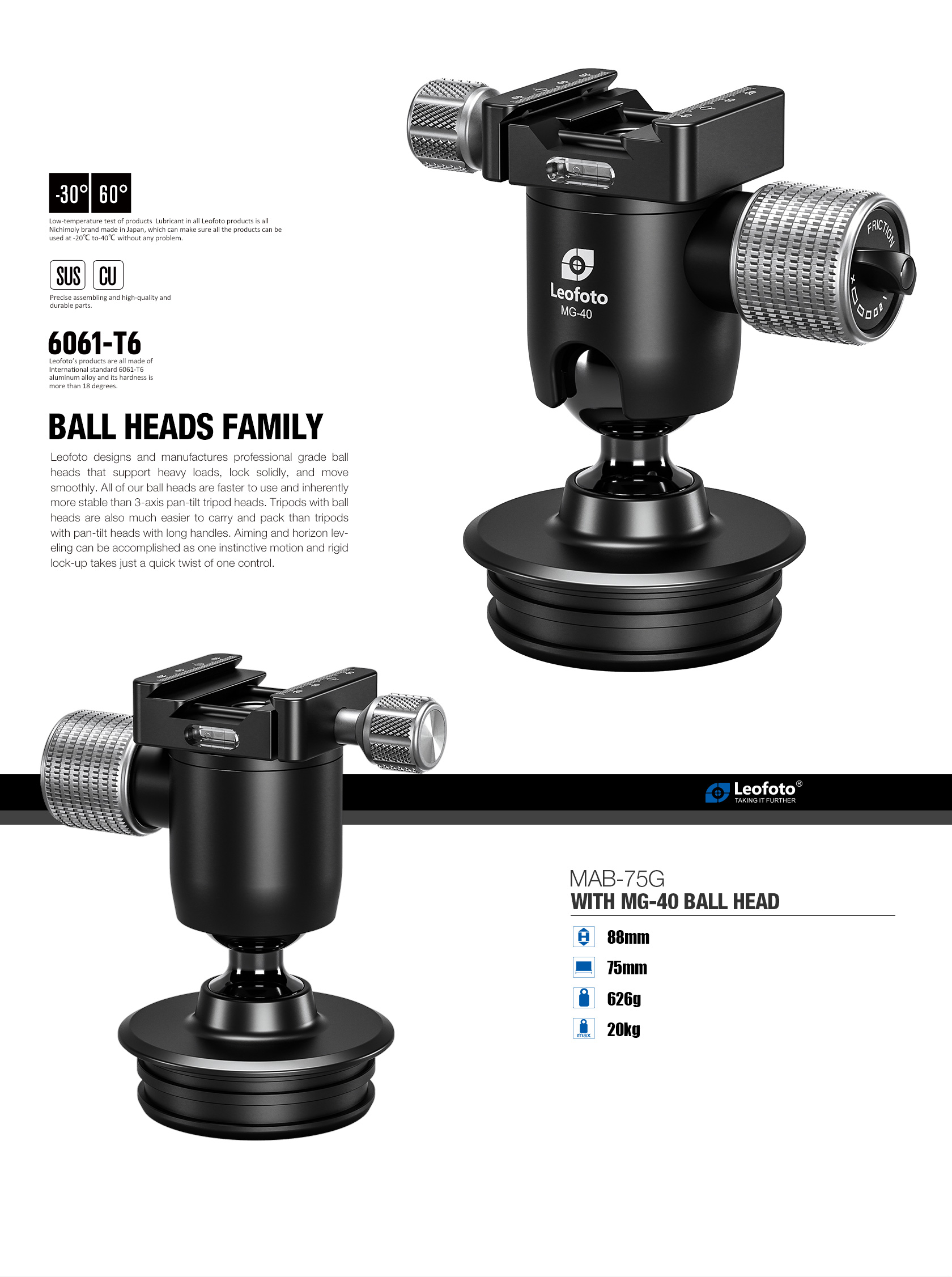 Leofoto MAB-75G Outdoors Ball Head with 75mm Systematic Adapter | Arca & Picatinny