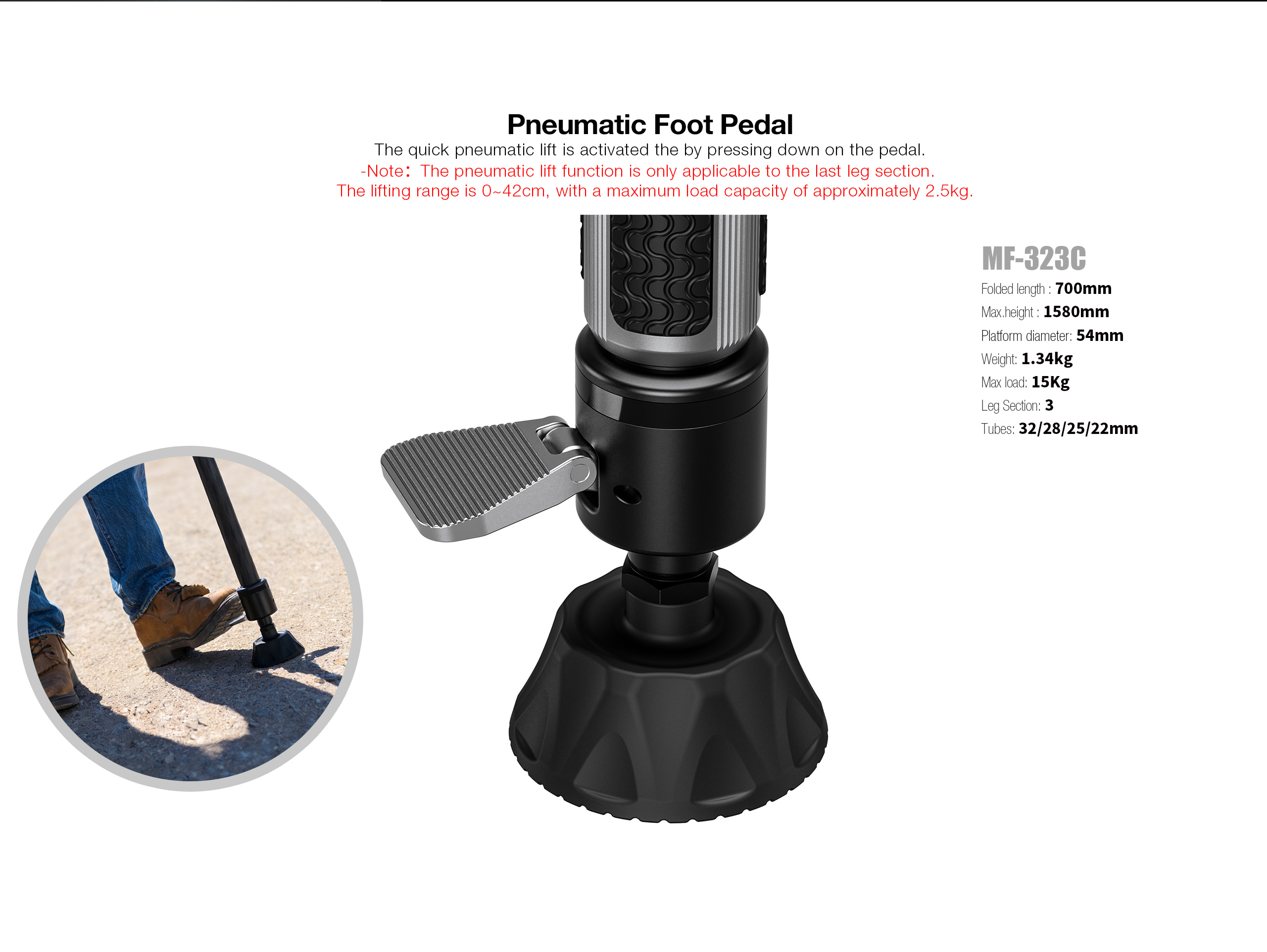 * Pneumatic Foot Pedal:The quick pneumatic lift is activated the by pressing down on the pedal.