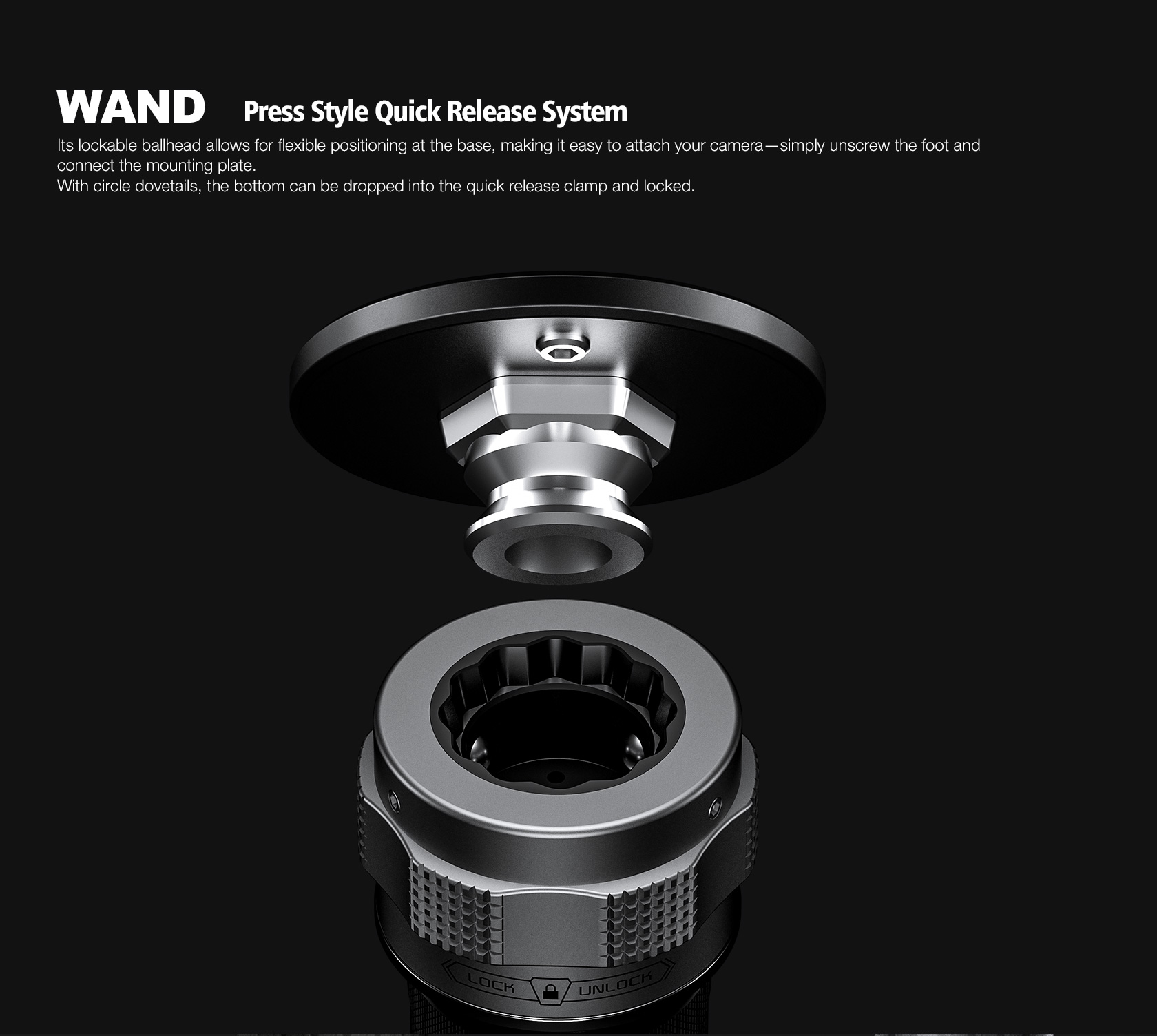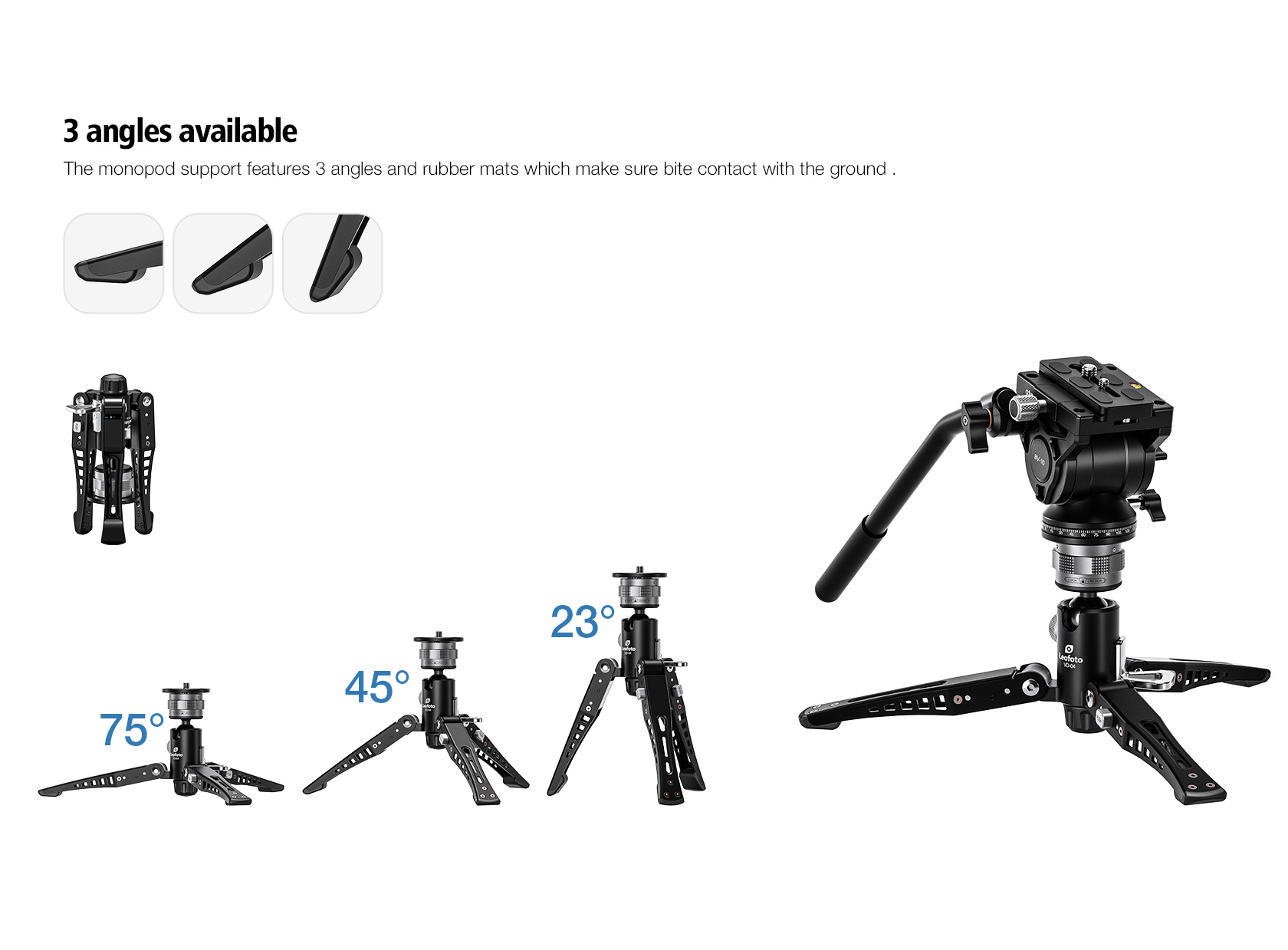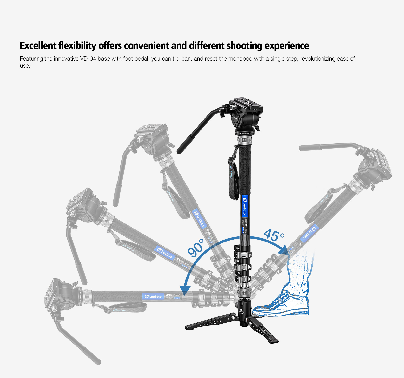 The VD-04 base enhances functionality with a foot pedal, allowing quick adjustments without using hands. Its 3 legs can be set at three different angles to customize height and stability, while the lockable ballhead provides smooth articulation. Additionally, the base includes a removable rubber foot that can be installed on the monopod for use as a standard monopod without the base.