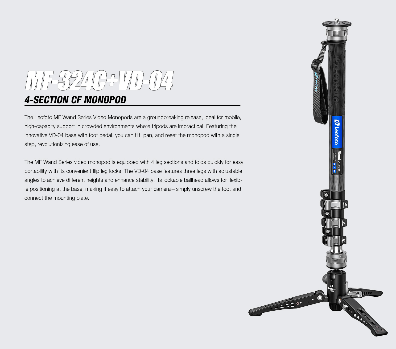 The Leofoto MF Wand Series Video Monopod is a groundbreaking release, ideal for mobile, high-capacity support in crowded environments where tripods are impractical. The monopod features 4 leg sections with convenient flip locks for quick folding and easy portability.