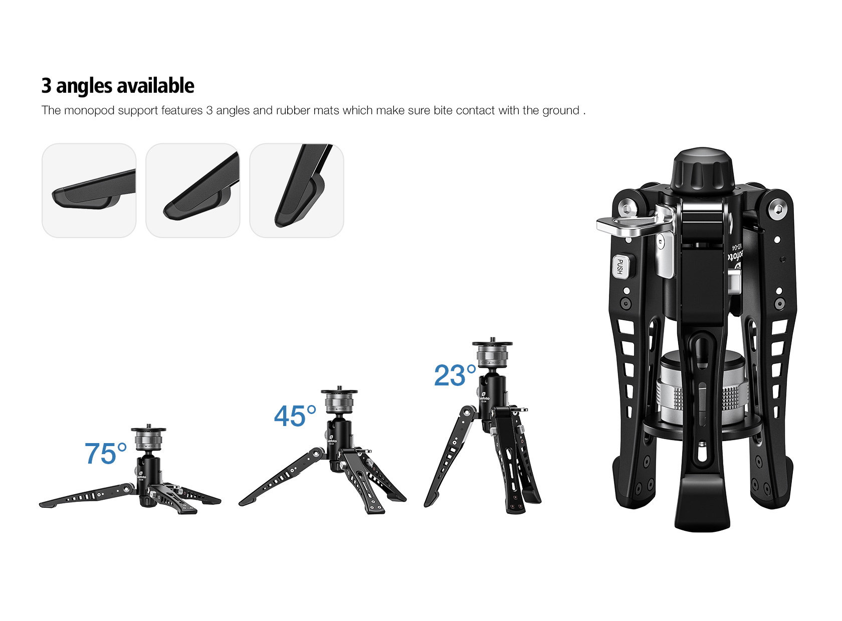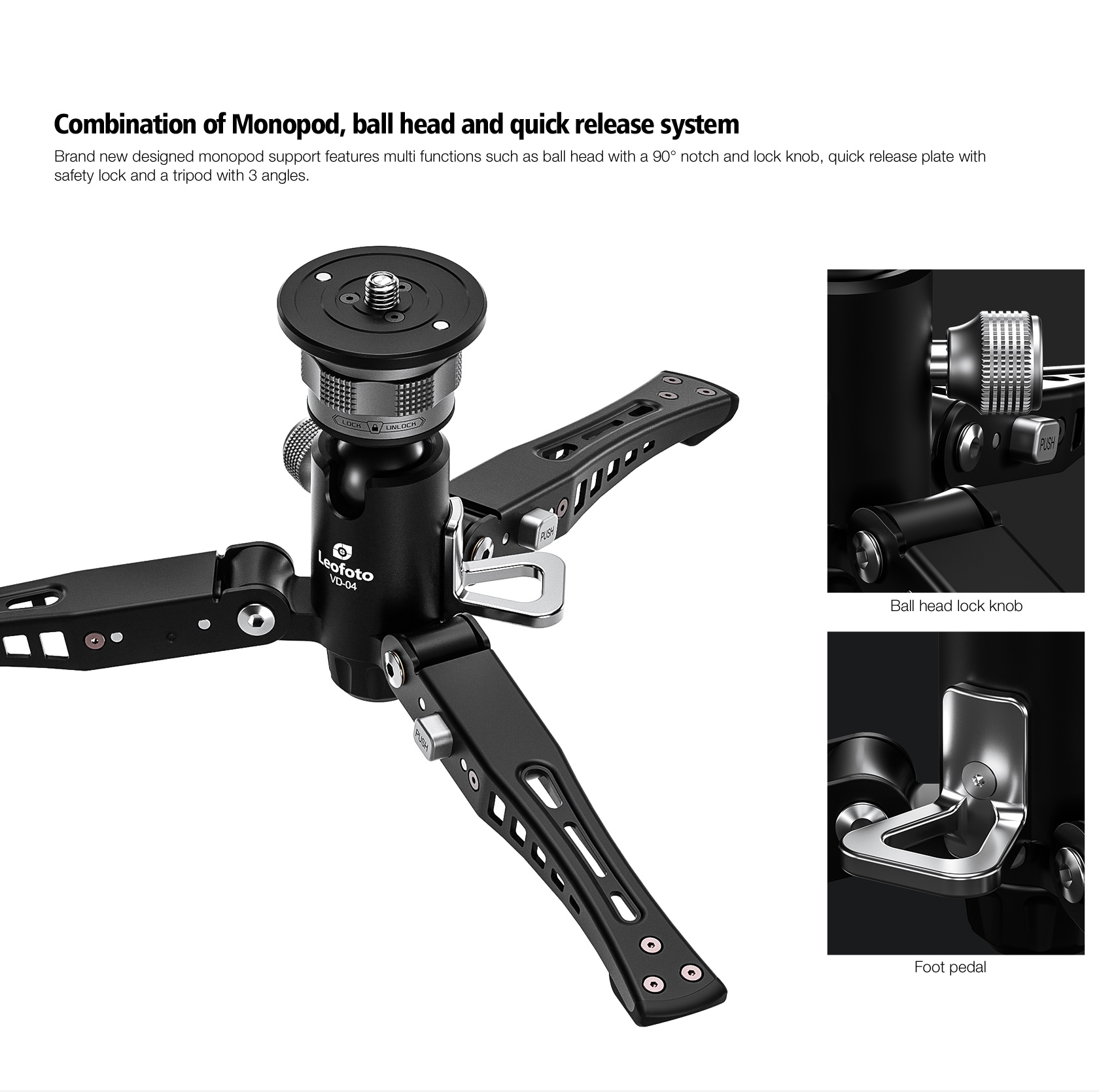 The VD-04 base enhances functionality with a foot pedal, allowing quick adjustments without using hands. Its 3 legs can be set at three different angles to customize height and stability, while the lockable ballhead provides smooth articulation. Additionally, the base includes a removable rubber foot that can be installed on the monopod for use as a standard monopod without the base.