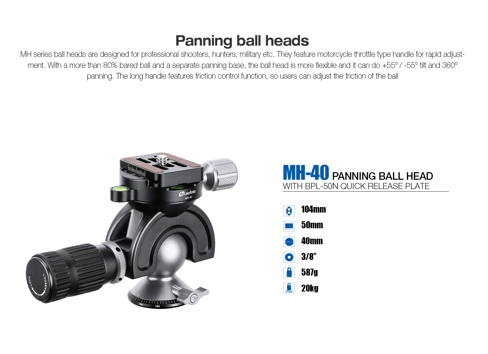 The Leofoto MH-40 Full Dynamic Ball Head with Handlebar Control is designed for photographers, shooters, hunters, and military applications. It features a motorcycle throttle-style main knob for rapid adjustment. With a more than 80% bared ball, it can provide a +/-55° tilt range, and the separate panning base features an independent locking knob and full 360° rotation. The friction tension can be adjusted and locked in place on the main control knob, which can extend in length from 70 to 92mm for finer control and improved ease of use when wearing gloves in cold conditions. The precision-machined 1.6″-diameter ball makes movement silky smooth, while providing a robust load capacity of 44 pounds.