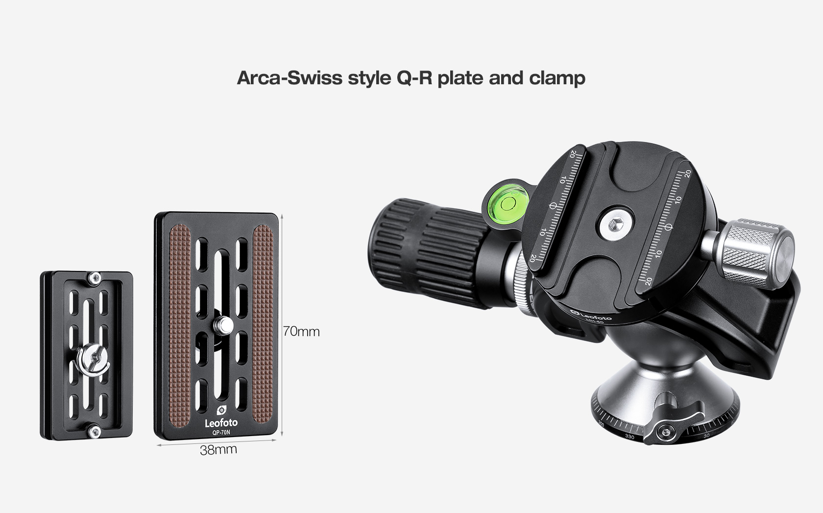 The integrated Arca-type quick release set uses a classic clamping knob and has a precision scale for fast balance and repeatable setups. The included QP-70N quick release plate has rubberized, non-marring traction pads to prevent movement.