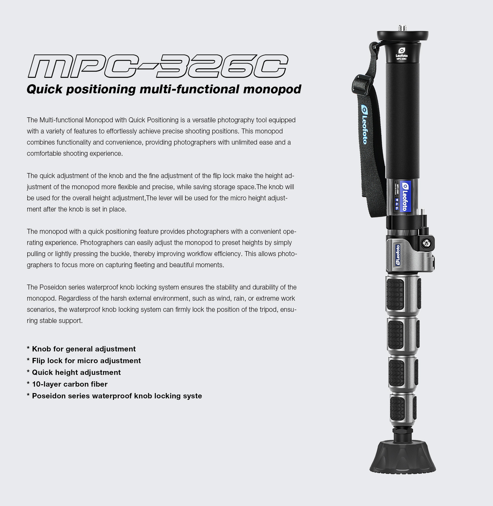 The newly designed Leofoto MPC Series Carbon Fiber Quick Positioning Multi-functional 6-section Monopod combines functionality and convenience, providing photographers with unlimited ease and a comfortable shooting experience.