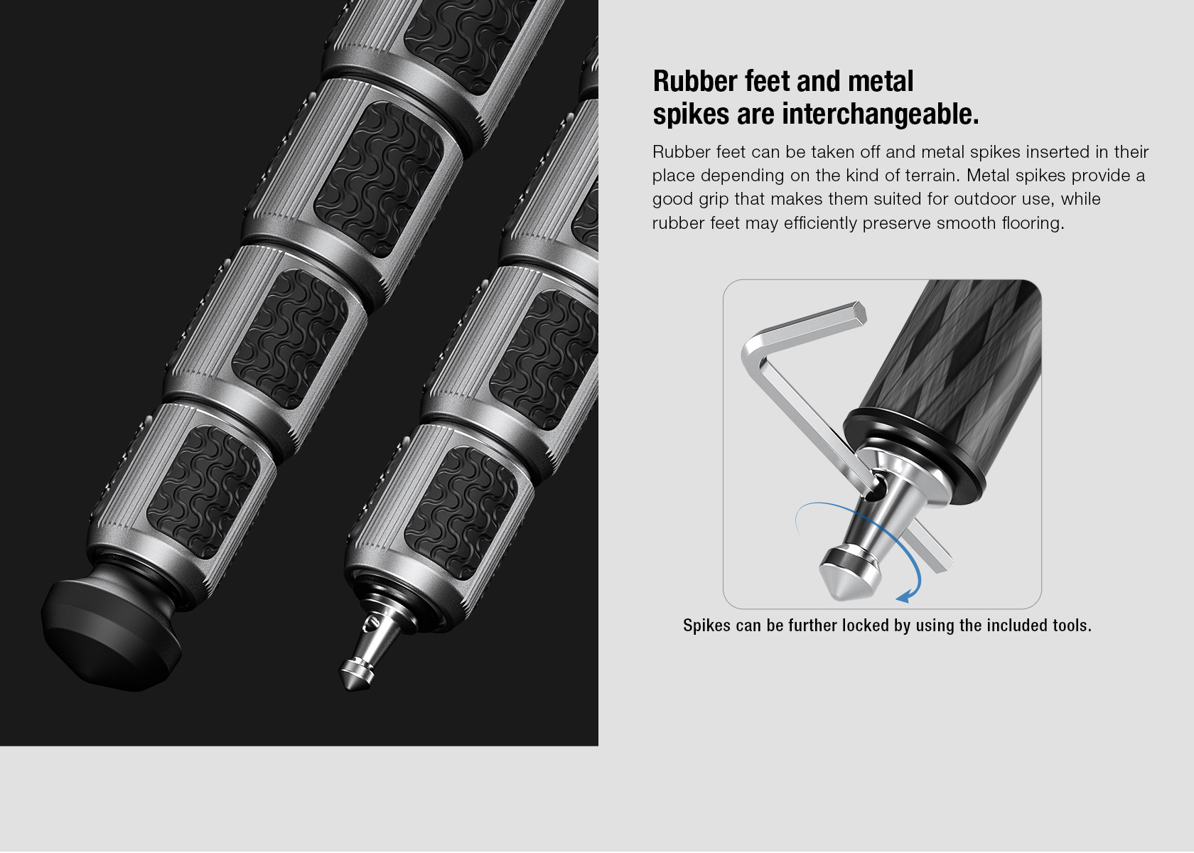 Adaptive Footing: Includes interchangeable rubber foot and spike foot, accommodating various shooting environments from polished interiors to rugged outdoor landscapes.