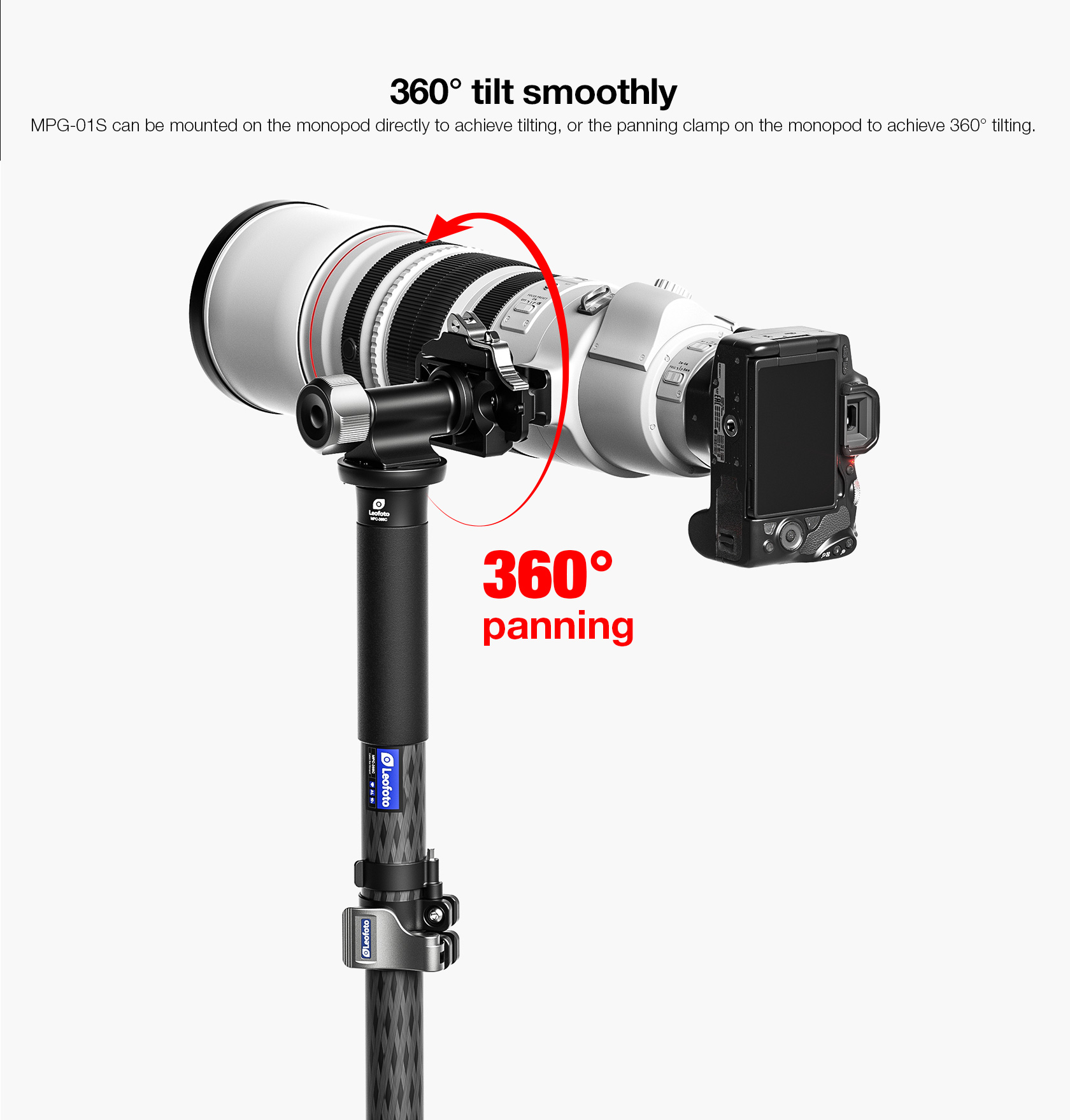 The MPG-01 is an innovative, compact monopod head offering 360° rotation in a vertical tilting orientation. Constructed from durable aluminum alloy, it features an Arca-type dovetail base with a 3/8”-16 threaded mounting socket, compatible with standard threaded tips or existing Arca-type clamps. It easily attaches to large lenses with Arca-type dovetail feet or plates, delivering smooth, fast movement—ideal for sports, action, or wildlife photography. The clamp is fixed and non-removable.