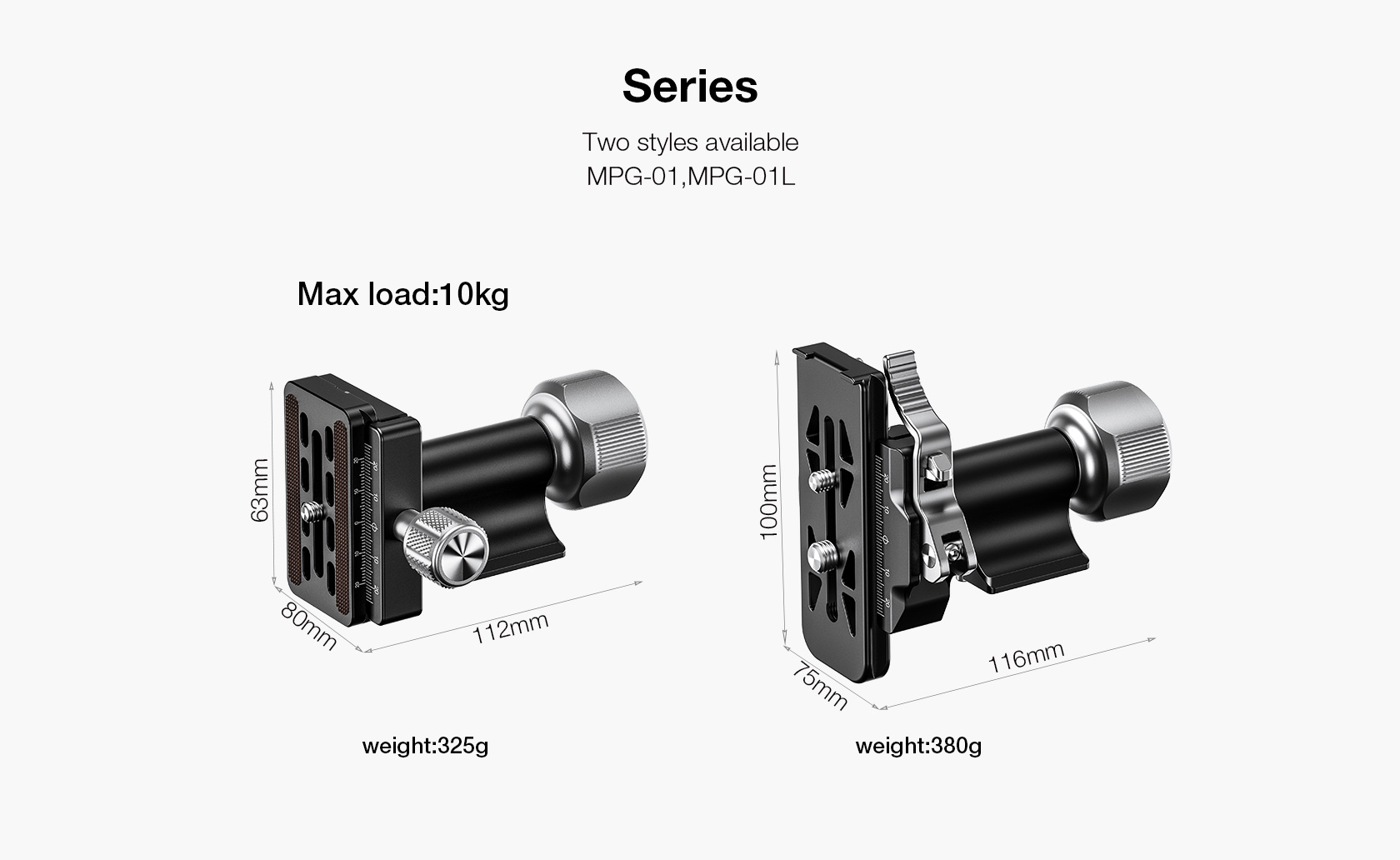 MPG-01L: Newly designed lever-release clamp with a safety latch to prevent accidental unlocking. Includes a redesigned Arca plate for long lenses, compatible with both 1/4” and 3/8” screws.