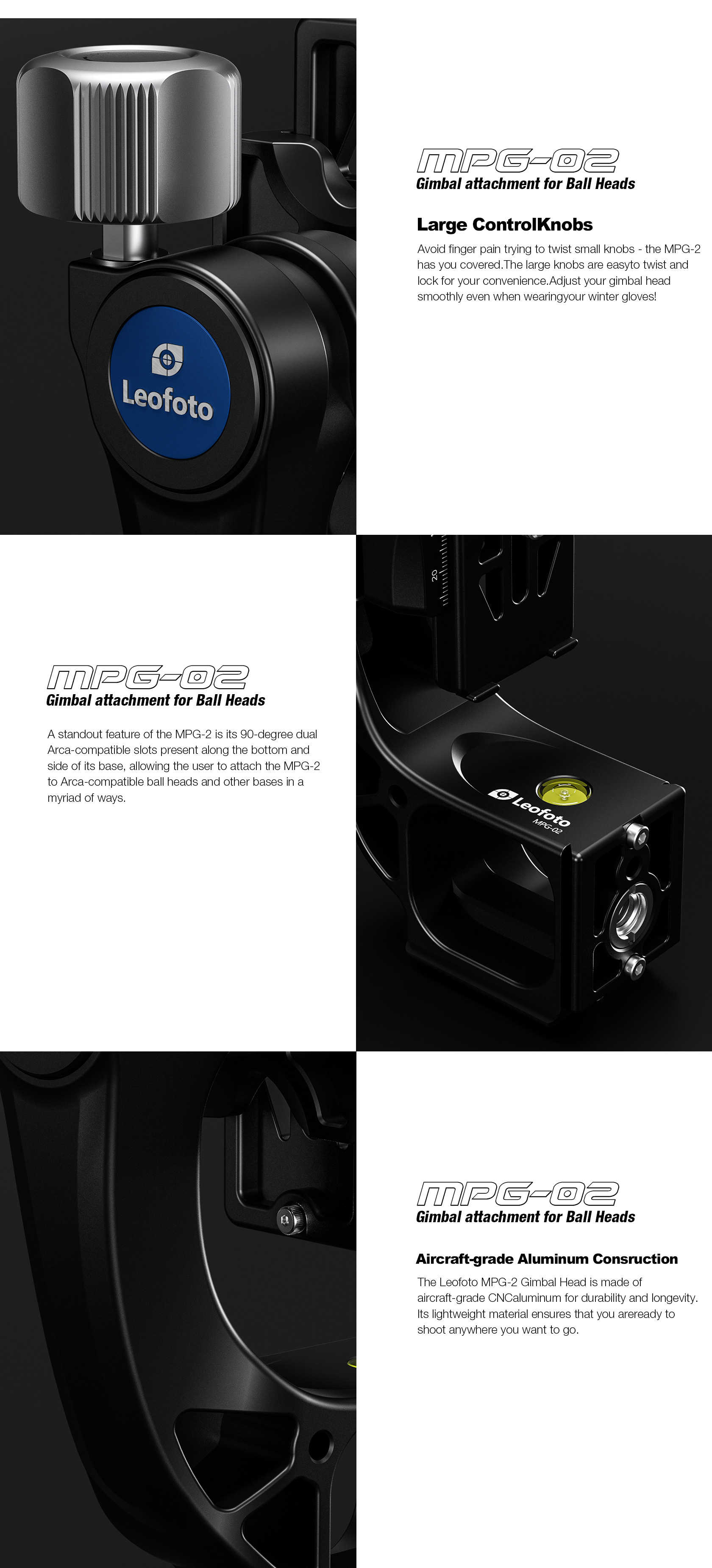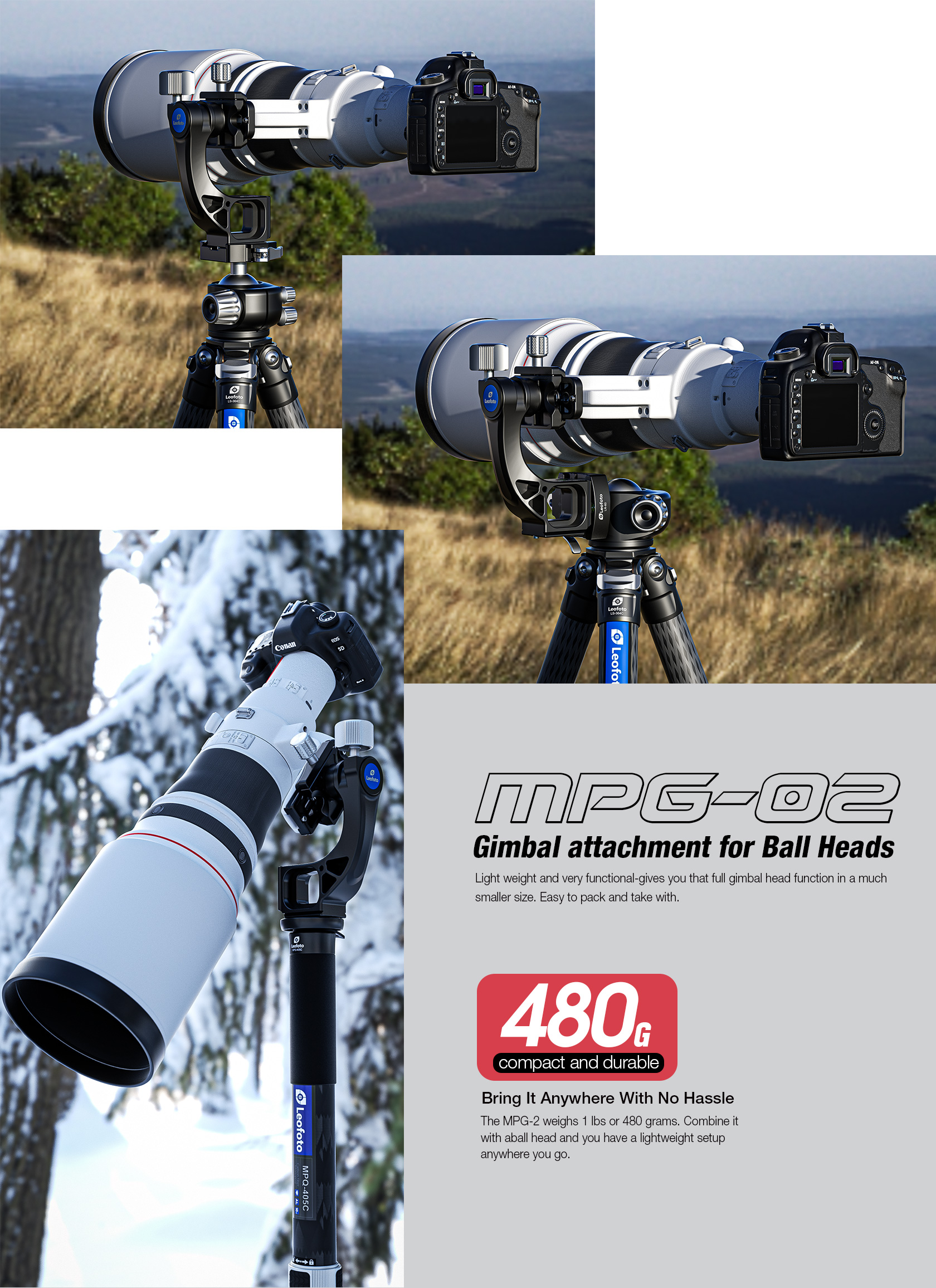 The Leofoto MPG-02/L Gimbal Attachment converts a standard ball head into a gimbal-style setup, crafted from CNC-machined aluminum for durability and precision. It features two Arca-type dovetail bases, a 3/8”-16 threaded mounting socket for broad tripod and monopod compatibility, and a redesigned Arca plate optimized for long lenses, supporting both 1/4” and 3/8” screws.