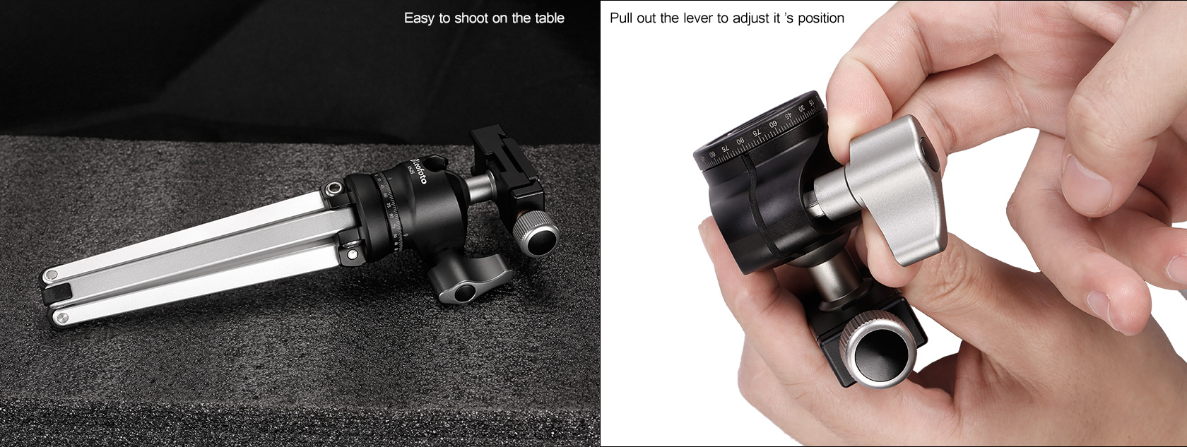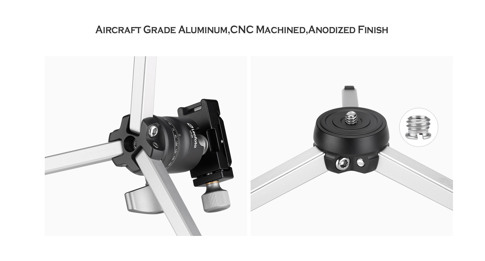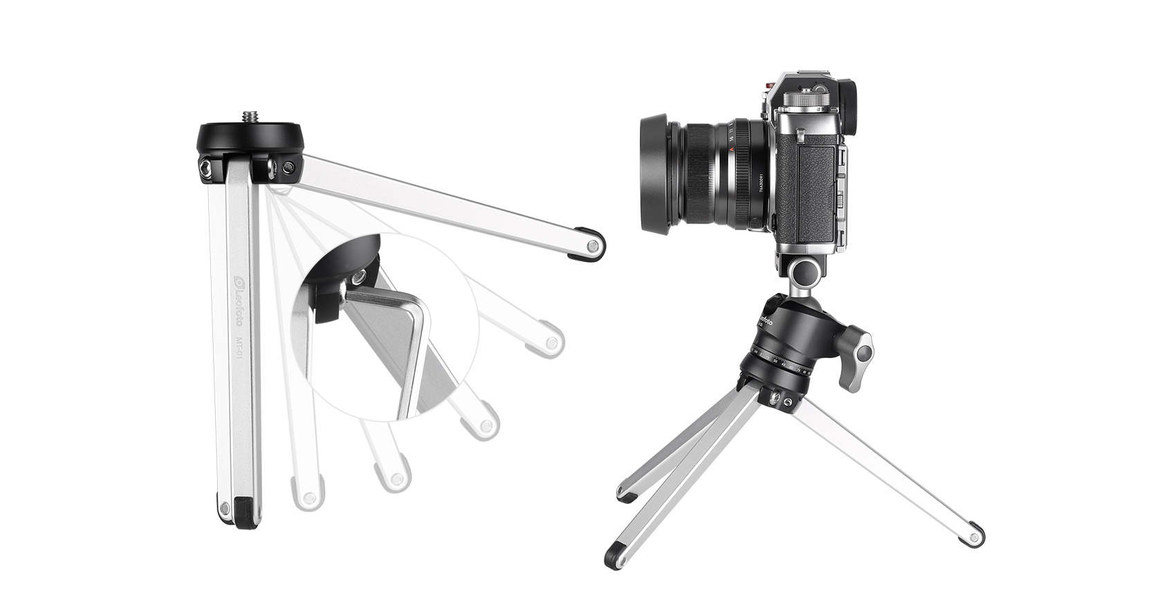 The Leofoto MT-01 Mini Tripod adjusts into different positions without any knobs or levers having to be used. Just set each leg to the desired angle individually. The compact single leg section tabletop tripod features a 1/4″-20 mounting screw and comes with a 3/8″-16 mounting socket.