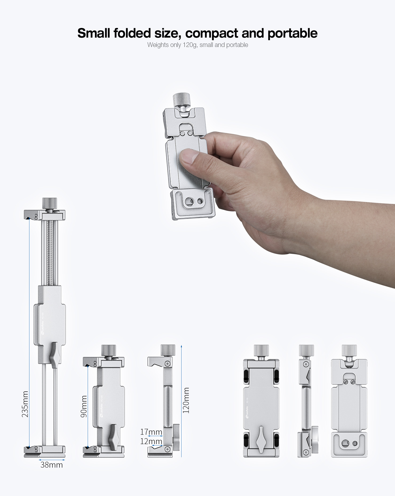 The Leofoto MT-03 is a tripod that is packed with innovative features to maximize its usefulness while remaining extremely compact. This mini tripod has been CNC machined out of aluminum and hard annodized, which enhances durability and adds rigidity. Featuring two leg sections in a unique folding design, the MT-03 also has a 1/4″ mounting screw and several 1/4″-20 threaded holes along the leg segments to mount small accessories and the legs can be opened at three different angles. The articulated sections can be used as hooks to attach the tripod to uneven or hard-to-reach surfaces. Despite weighing only 5.7 ounces, the tripod itself has a carrying capacity of 11 pounds, making it an ideal choice for travel photography.