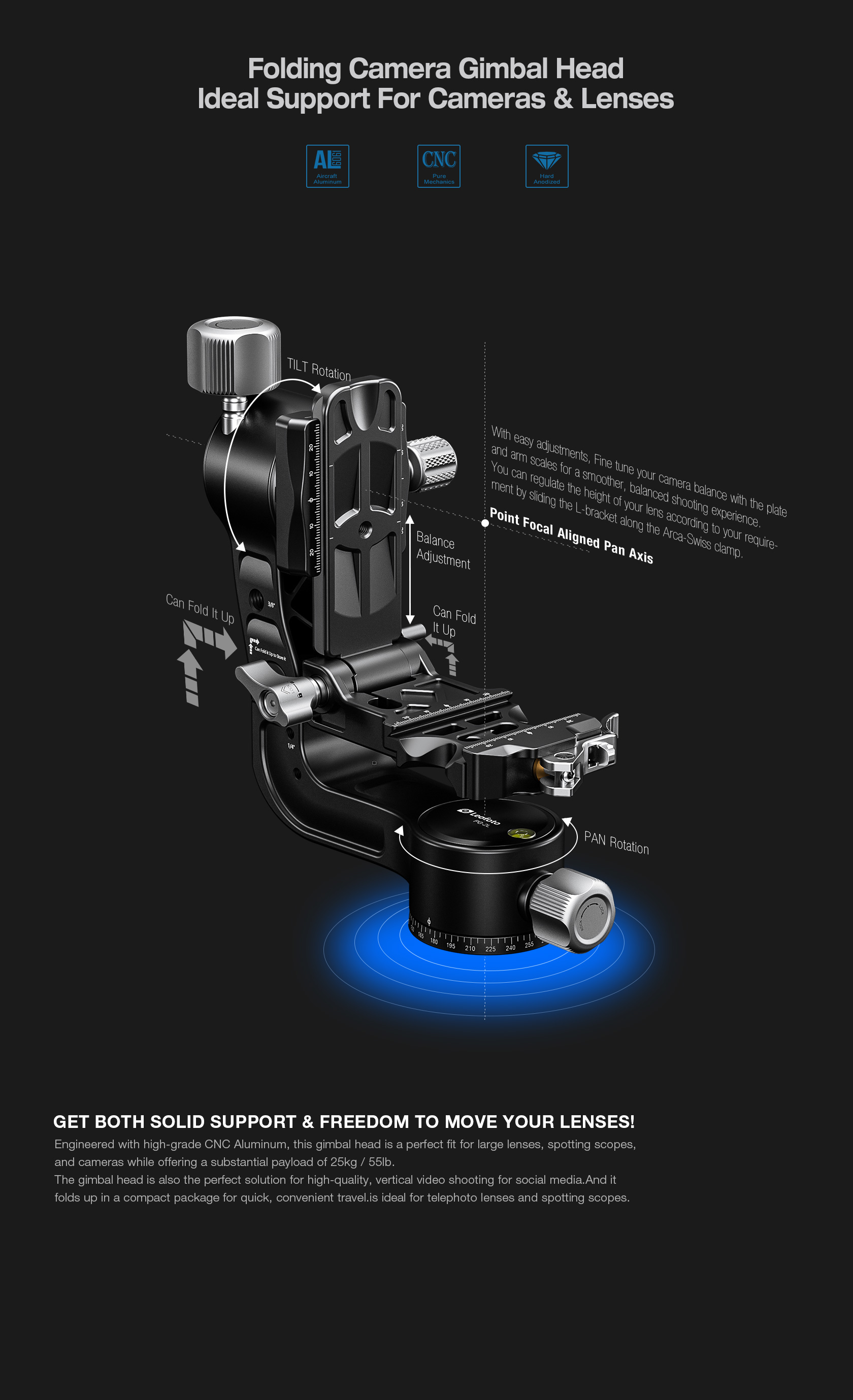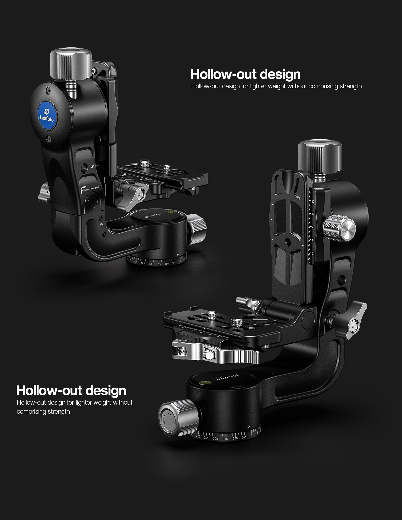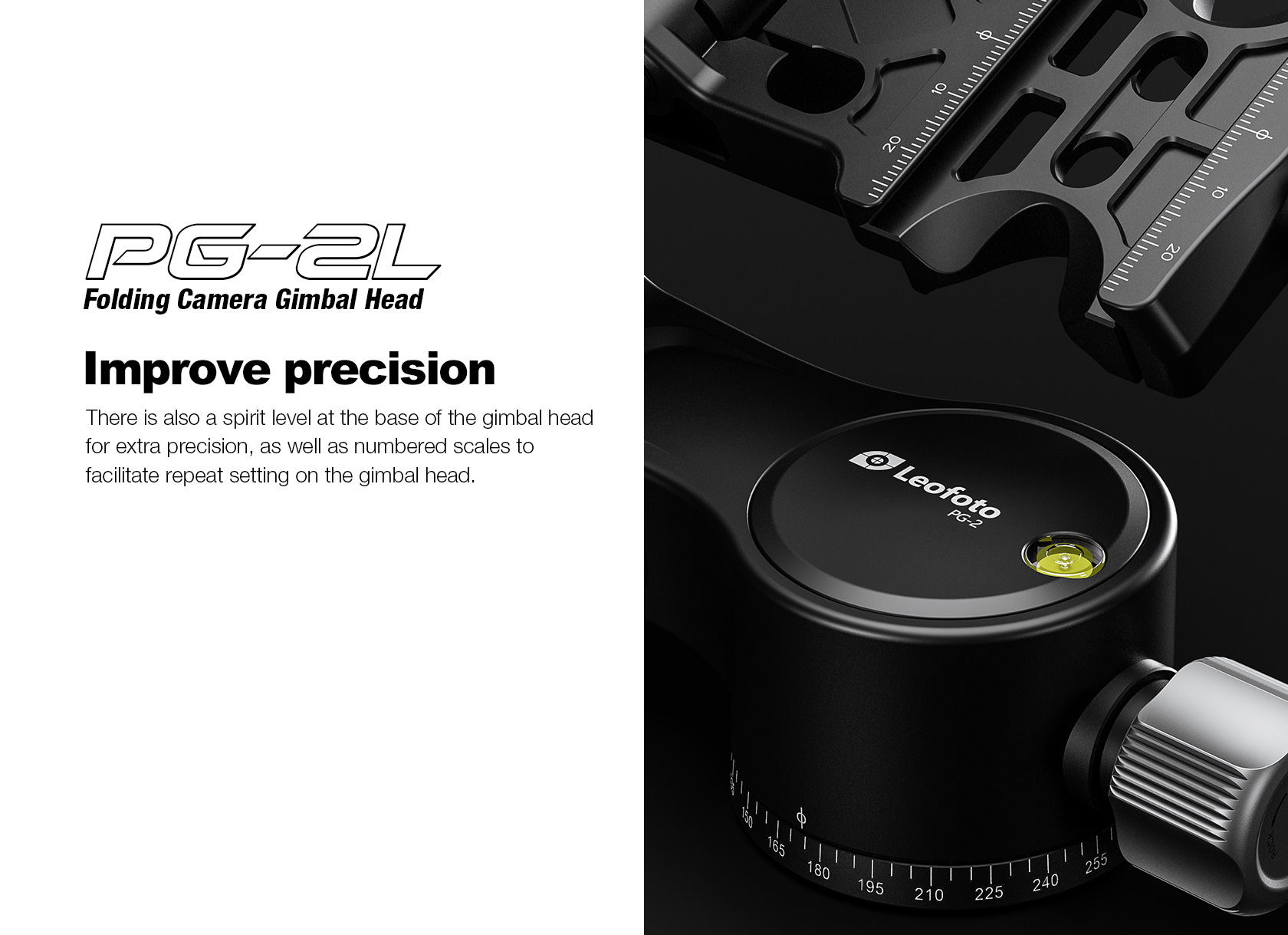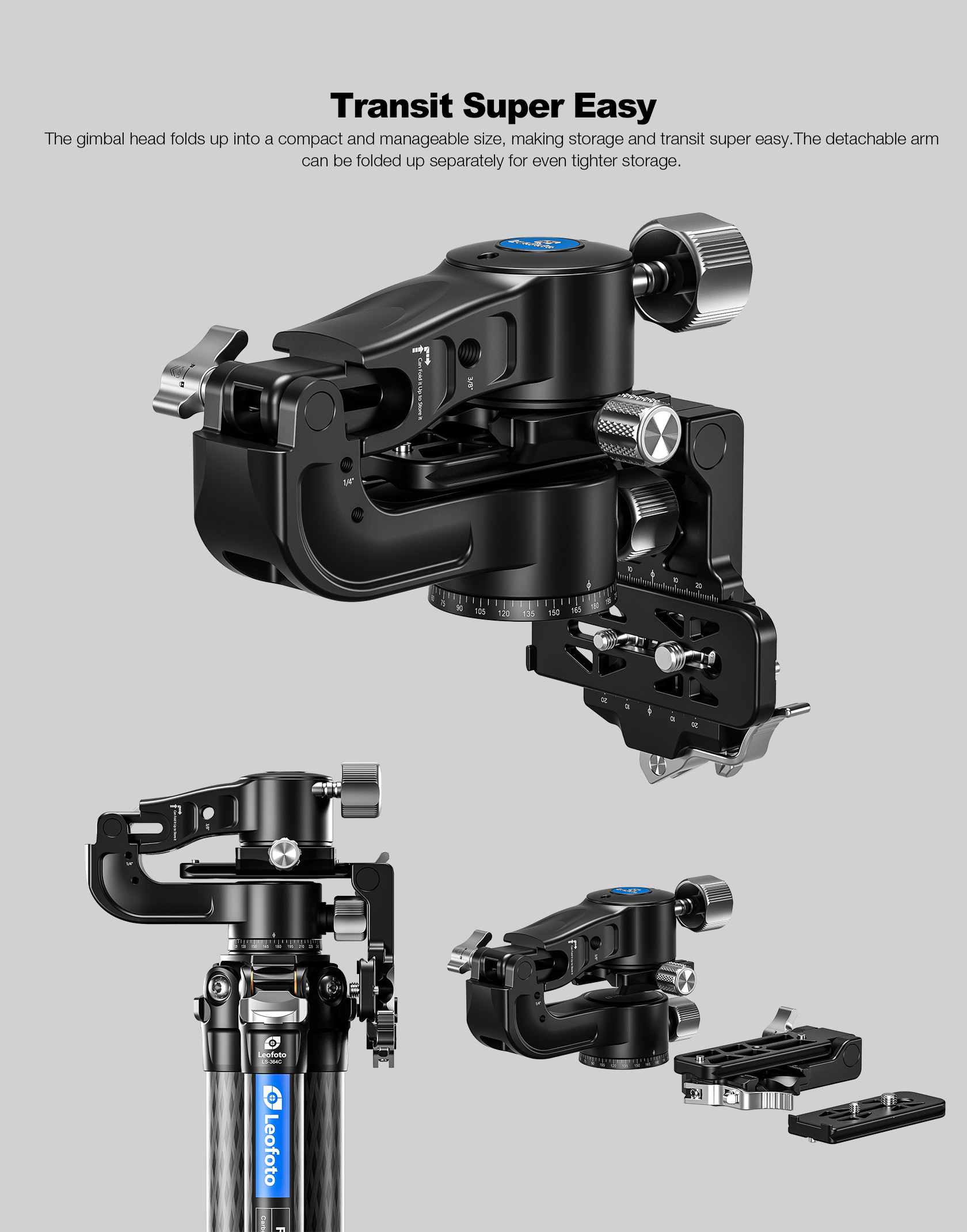 The Leofoto PG-2/PG-2L Folding Gimbal Head is constructed from T-6061 aluminum and hard anodized for maximum strength and durability. The PG-2 enables you to capture fast-moving subjects with a large and heavy telephoto lens that you otherwise could not do manually holding the lens. The arm swings back and forth and can be locked down at the required angle and the gimbal also has a bubble level on the base. The camera platform, which is Arca-type compatible, has height adjustability to help balance a telephoto lens on the head.  Along the arm of the gimbal are a 3/8″ and two 1/4″ accessory sockets. The design of the PG-2/PG-2L allows for the gimbal to collapse for a more portable footprint, perfect for traveling when space is limited. The body has also been hollowed-out to optimize the weight to strength ratio.