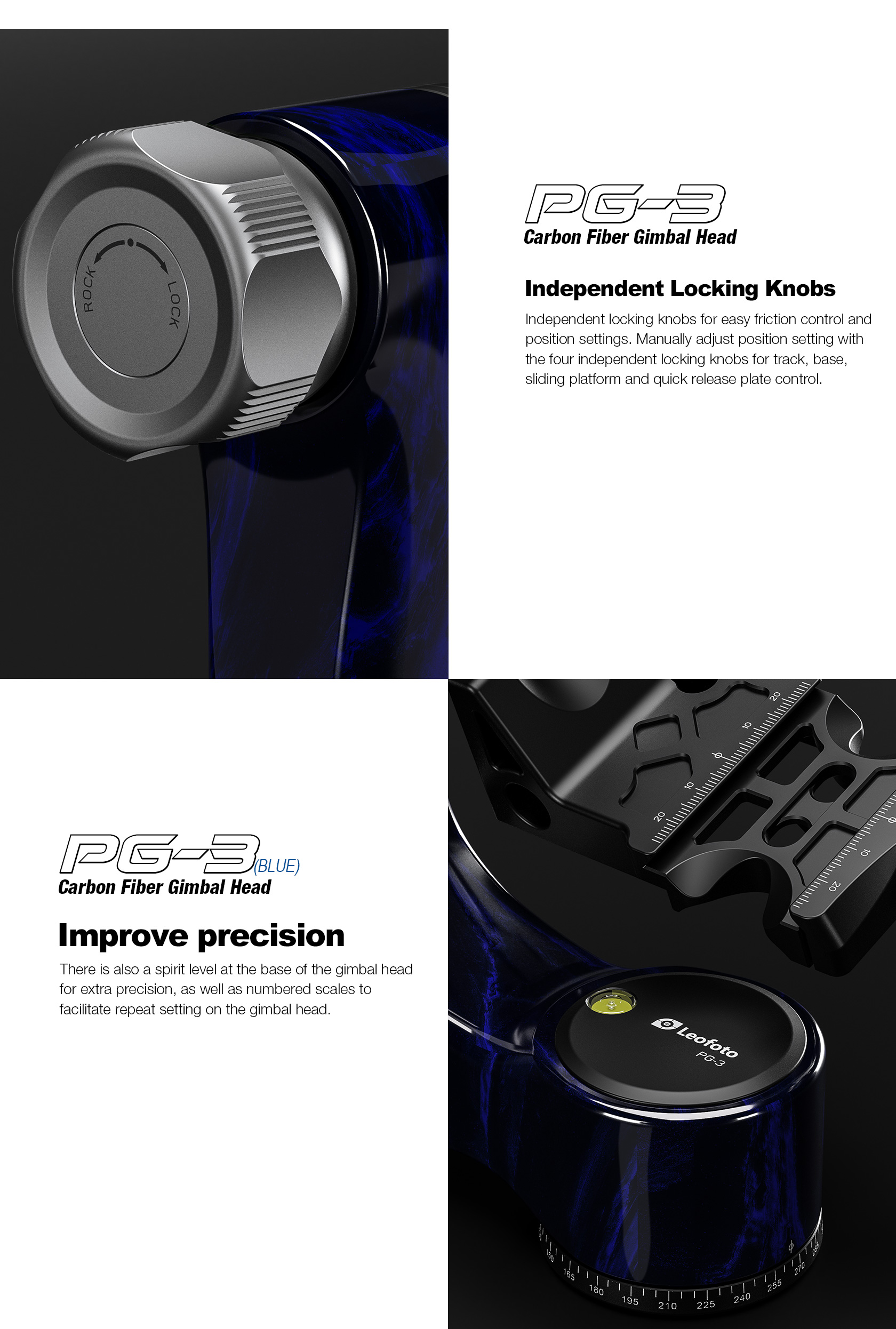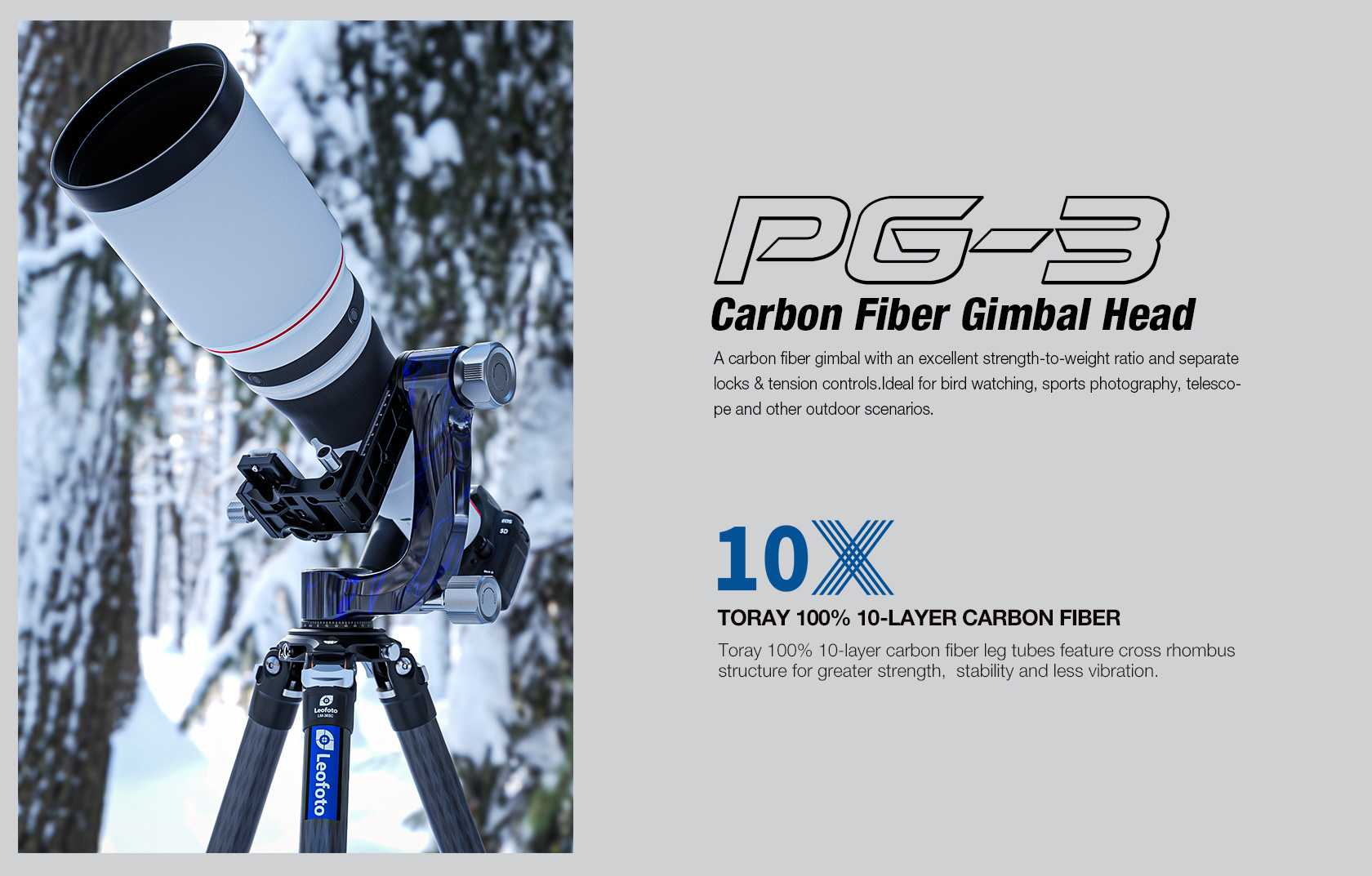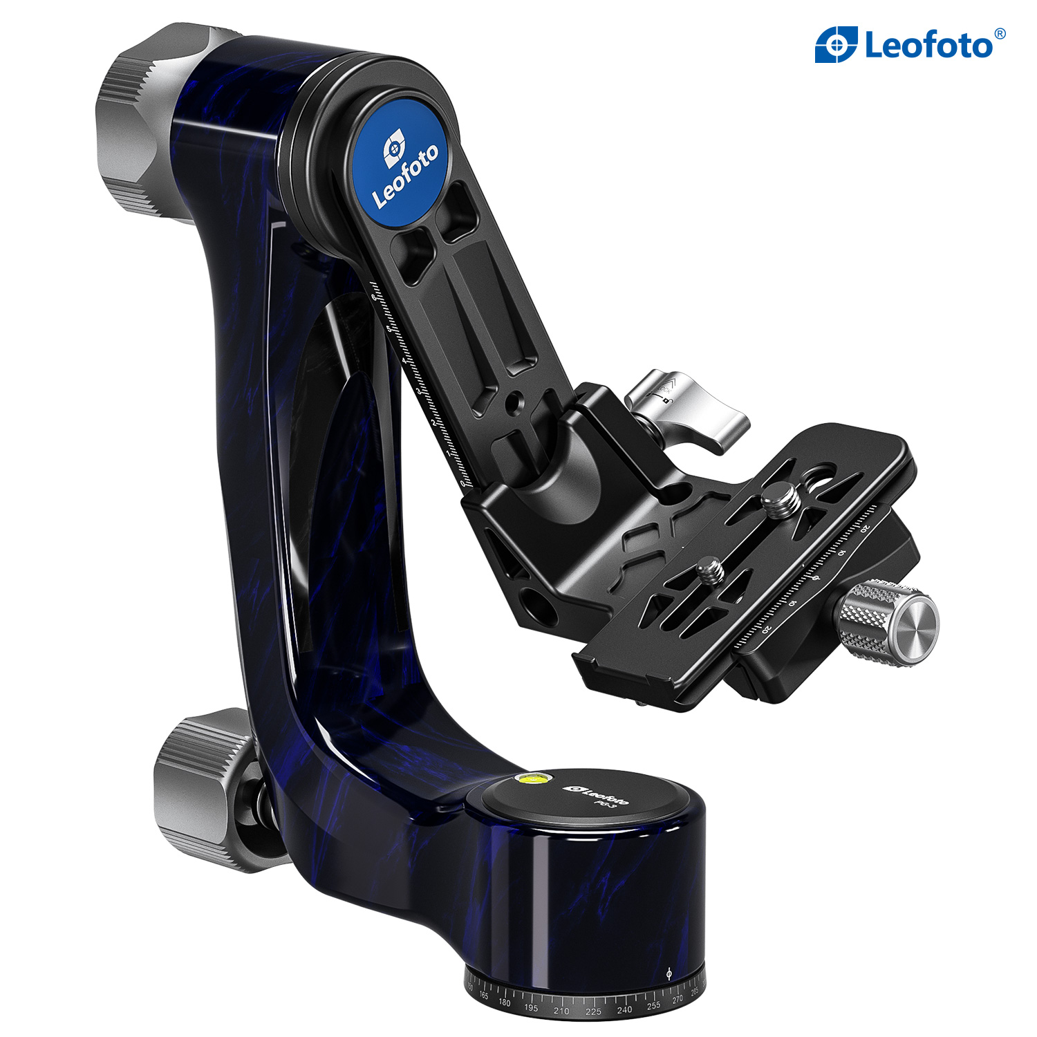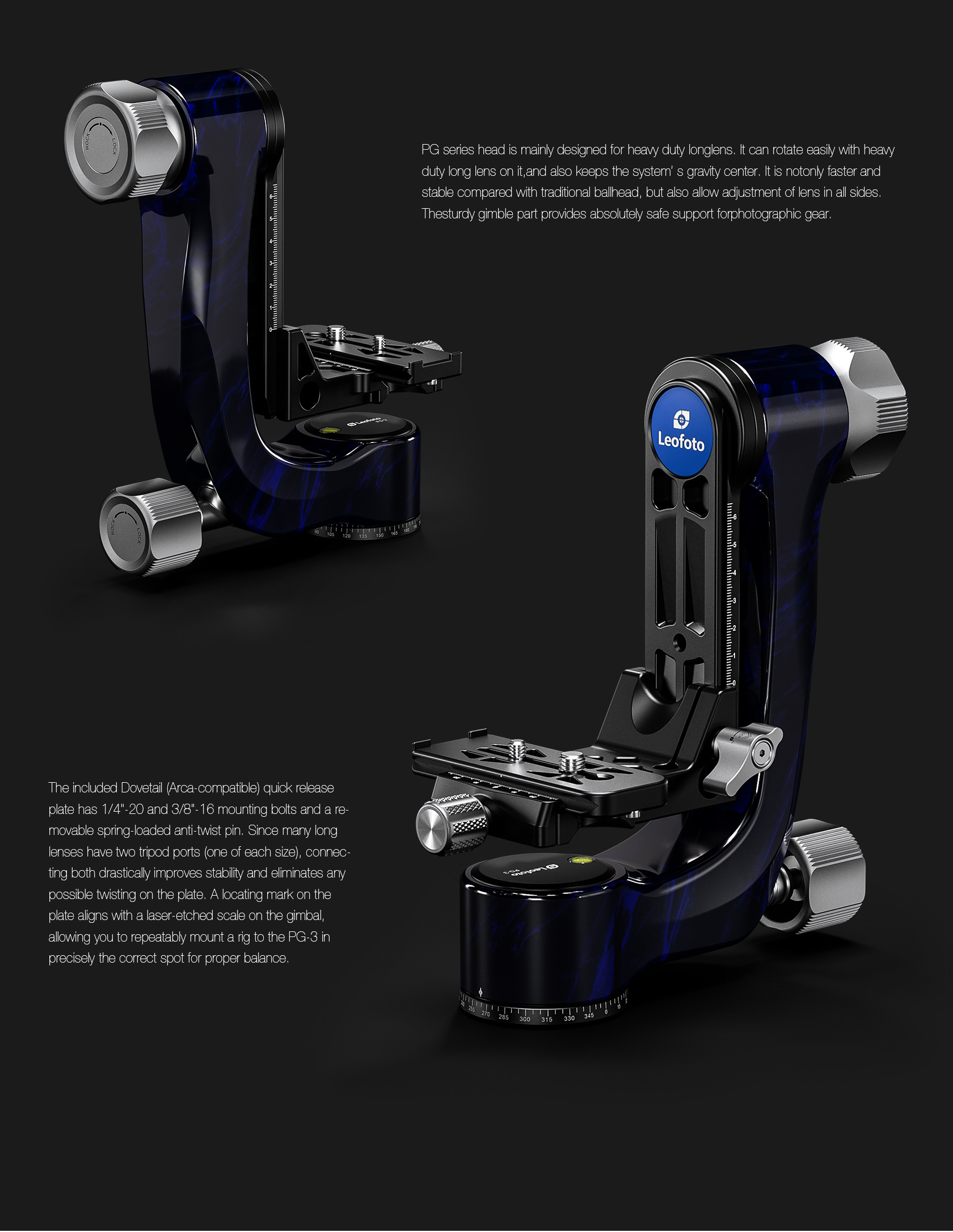 The Leofoto PG-3/L Carbon Fiber Gimbal Head is crafted from 10 layers of Toray carbon fiber, offering a lightweight yet robust gimbal setup. Its newly designed control knobs are smooth and positioned to avoid interfering with lens movement. The PG-3 allows photographers to track fast-moving subjects with large, heavy telephoto lenses, while the swinging arm can be locked at the desired angle and features a bubble level on the base. The Arca-type compatible camera platform includes height adjustability for precise lens balance, and the printed scale on the swing arm enables repeatable setups. A redesigned Arca plate optimized for long lenses supports both 1/4” and 3/8” screws, making the PG-3 ideal for portability without compromising performance.