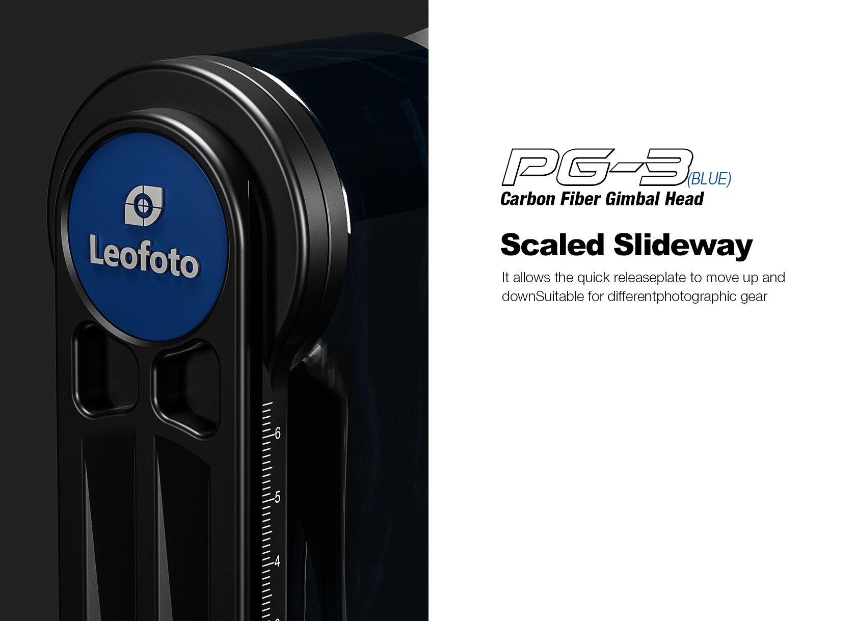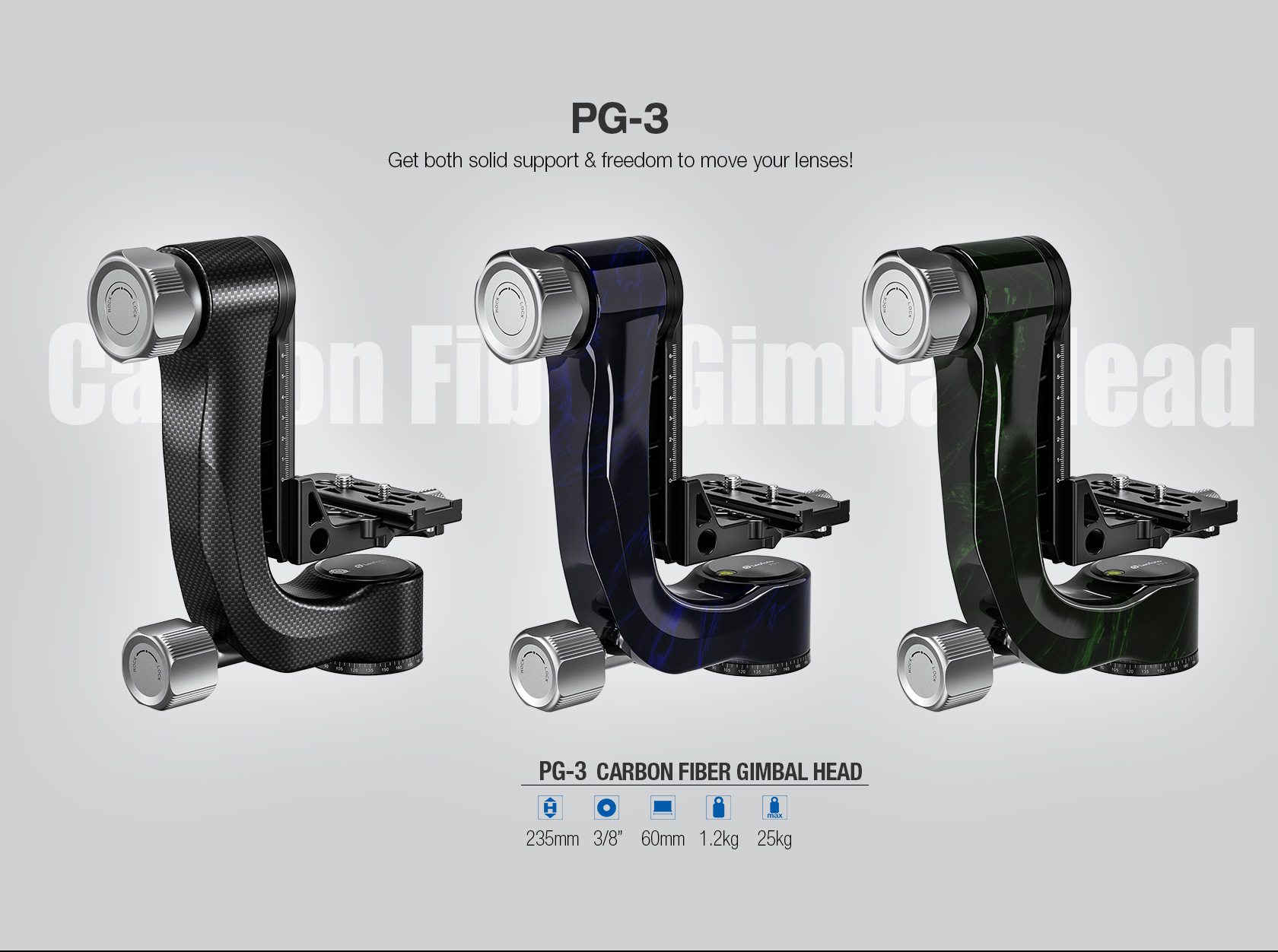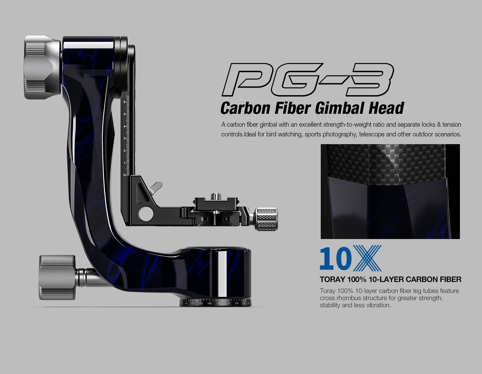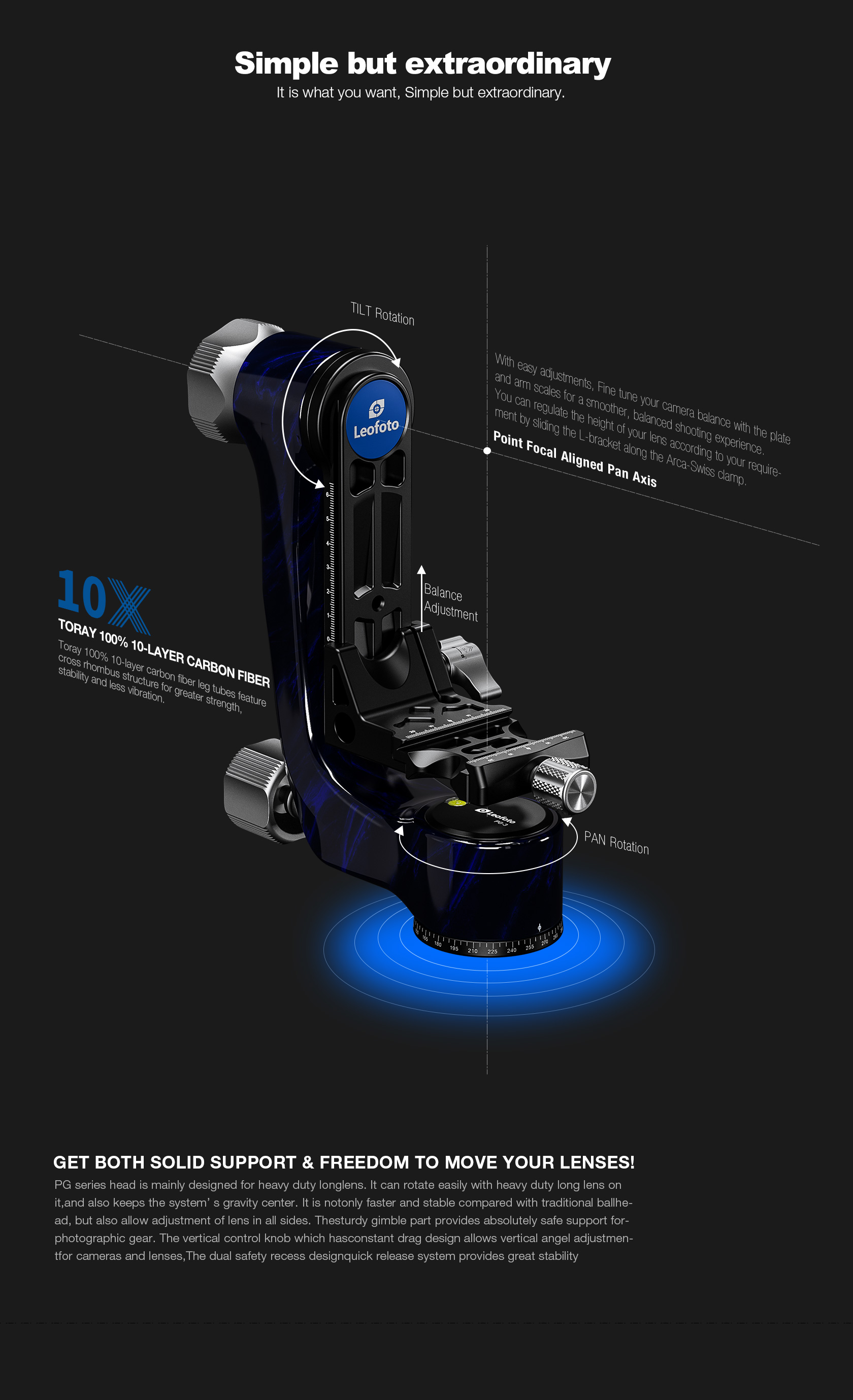 The Leofoto PG-3/L Carbon Fiber Gimbal Head is crafted from 10 layers of Toray carbon fiber, offering a lightweight yet robust gimbal setup. Its newly designed control knobs are smooth and positioned to avoid interfering with lens movement. The PG-3 allows photographers to track fast-moving subjects with large, heavy telephoto lenses, while the swinging arm can be locked at the desired angle and features a bubble level on the base. The Arca-type compatible camera platform includes height adjustability for precise lens balance, and the printed scale on the swing arm enables repeatable setups. A redesigned Arca plate optimized for long lenses supports both 1/4” and 3/8” screws, making the PG-3 ideal for portability without compromising performance.