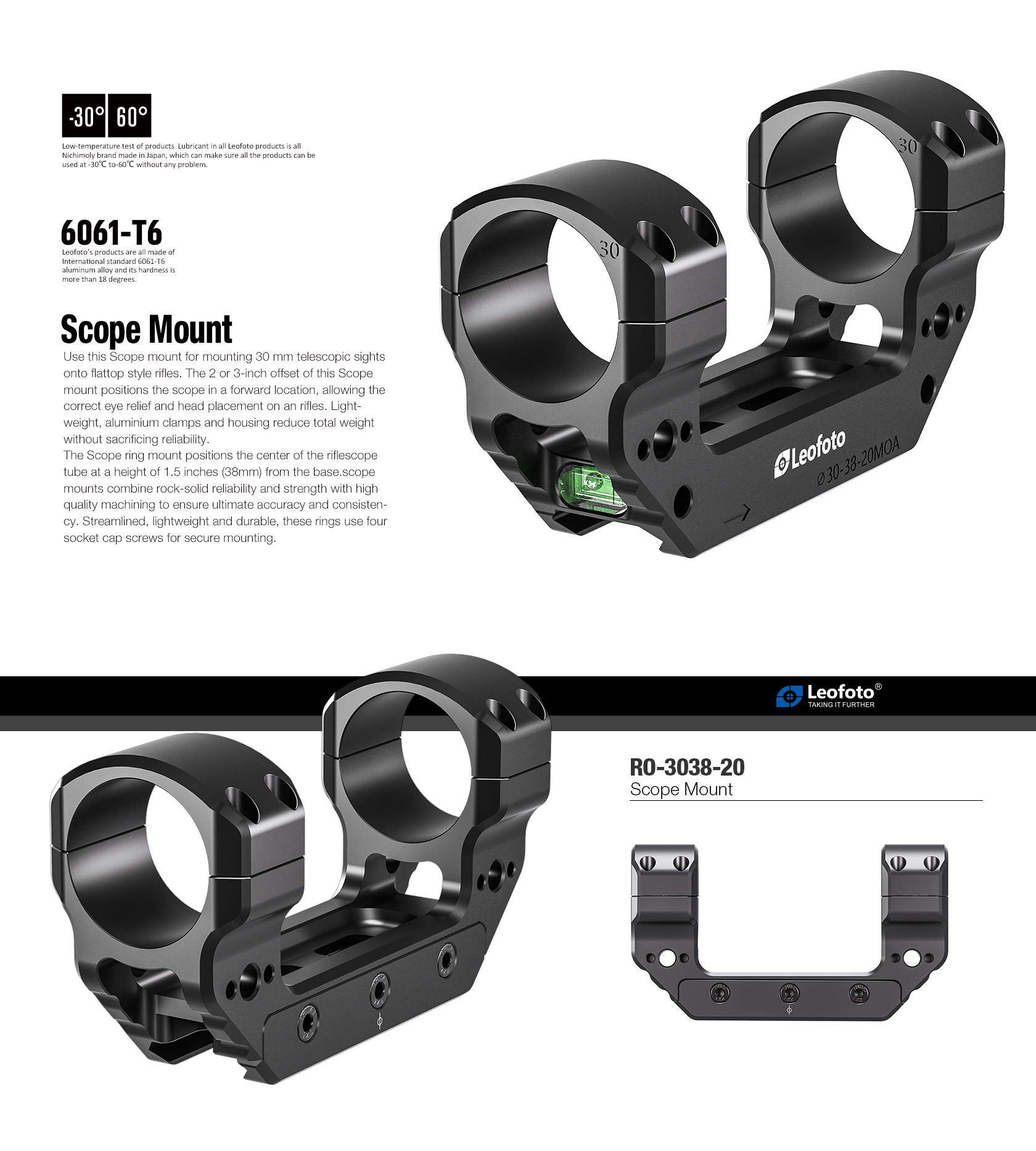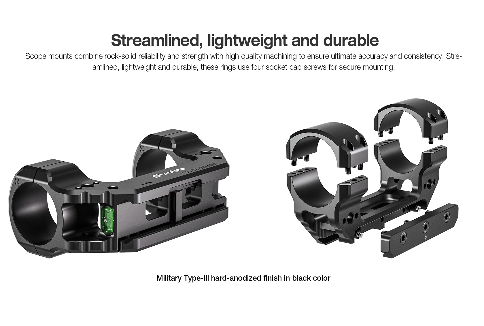 Use this Scope mount for mounting 30 mm telescopic sights onto flattop style rifles. The 2 or 3-inch offset of this Scope mount positions the scope in a forward location, allowing the correct eye relief and head placement on an rifles. Lightweight, aluminium clamps and housing reduce total weight without sacrificing reliability.