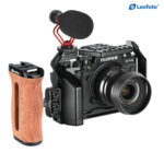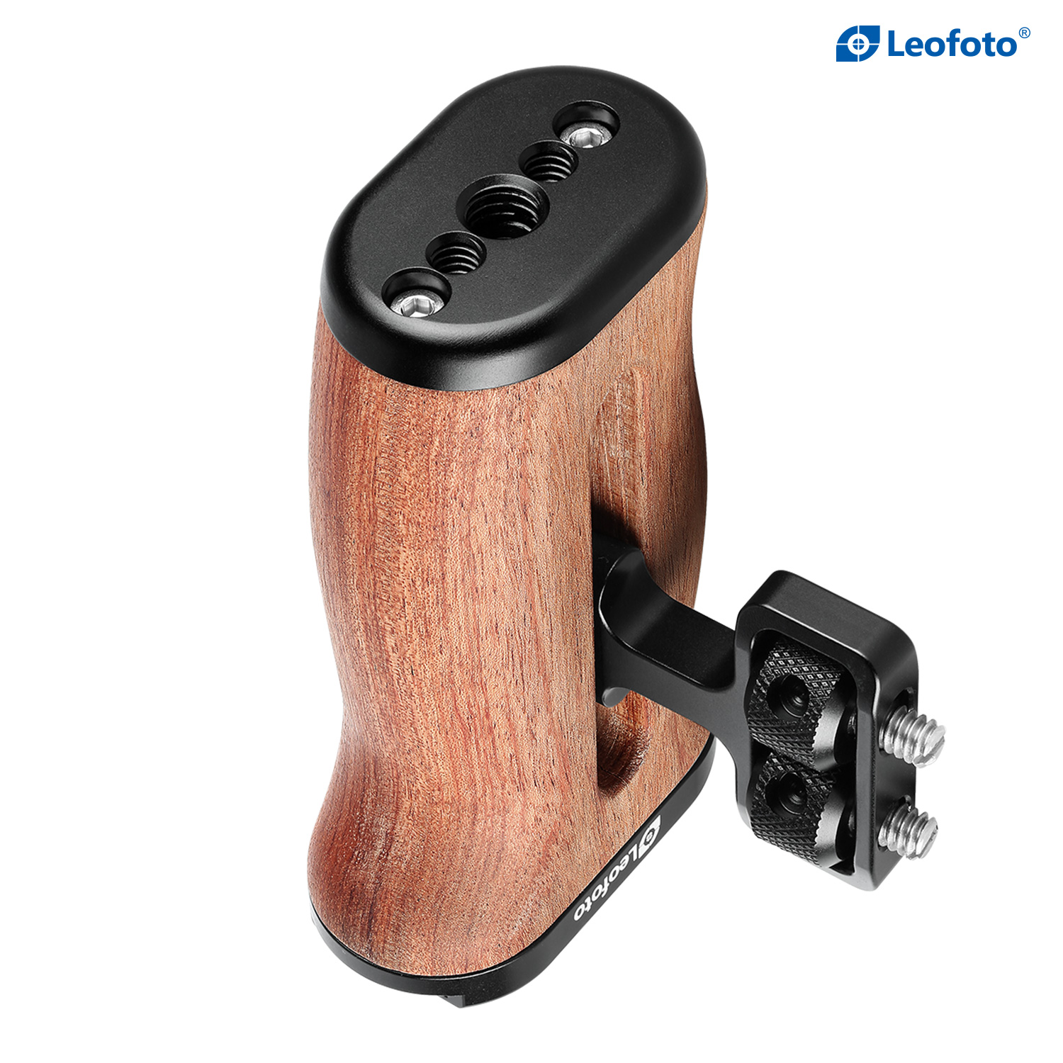 A comfortable grip with a unique Brazilian rosewood grain pattern, the Leofoto Rosewood Handgrip can be attached to most cages with 1/4″-20 mounting threads on the side. The handgrip can be used on either the right or left side by adjusting the orientation of the mounting bracket. The mounting screws are set into knurled knobs that allow you to finger-tighten the mounting screws to your cage.