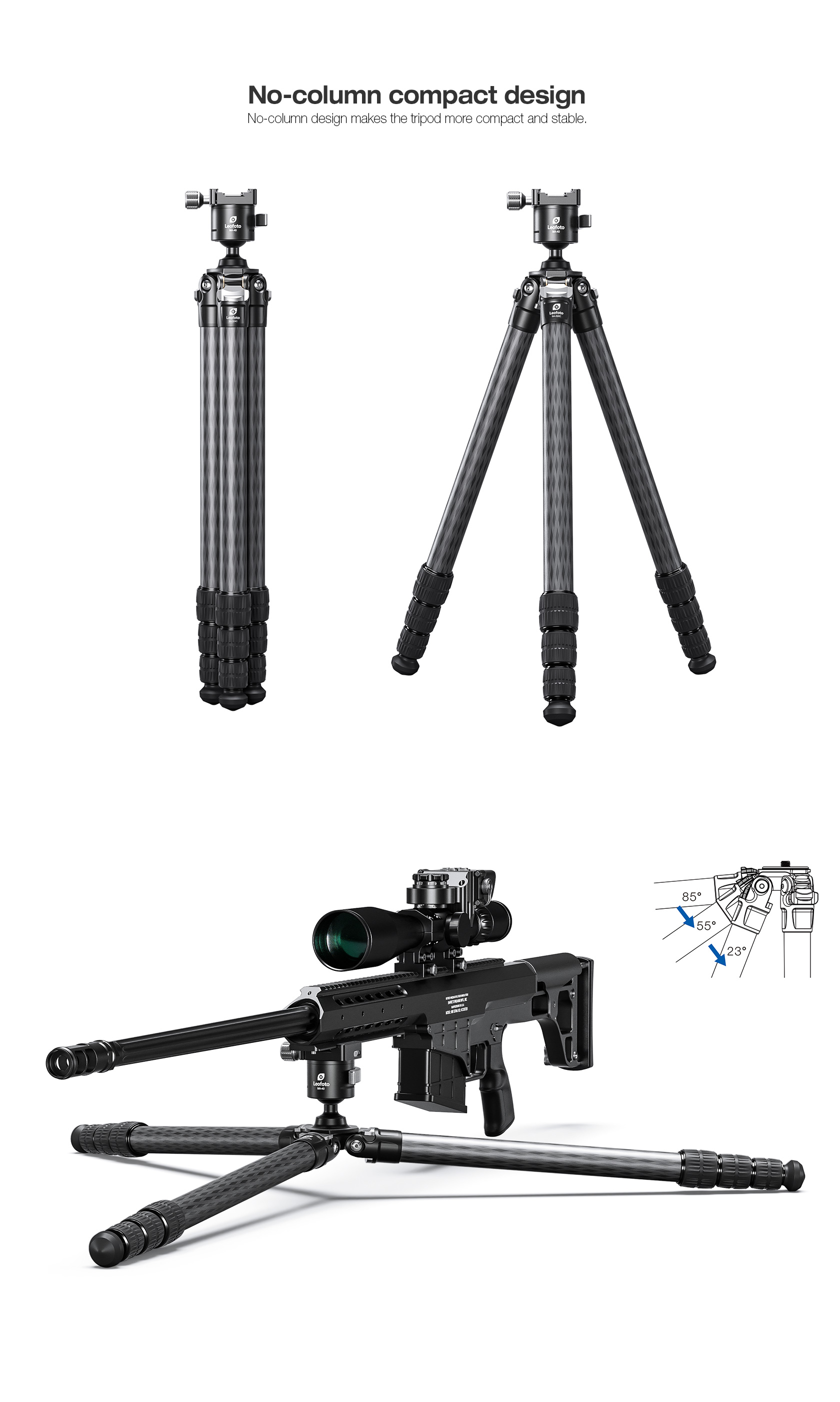 The Leofoto SA Series tripods are one of the most compact collapsed setups on the market with a perfectly balanced weight to strength ratio. The angle stop design has also been improved from the standard pull tab to a knurled bar which allows the user to adjust the angles with only one hand as opposed to two. The SA Series offers unparalleled versatility, built as a hunter’s companion who also enjoys long days on the range, but most requested by military, law enforcement, competitive shooters or those simply looking for one of the most compact and reliable shooting supports on the market. The SA Series tripods offer maximum rigidity, capable of supporting non-traditional shooting positions with a heavy load capacity. These tripods feature three angle stop positions to increase shooting capabilities and a compact design which maintains a small footprint, creating a tripod setup which is extremely easy to pack and carry on the go.