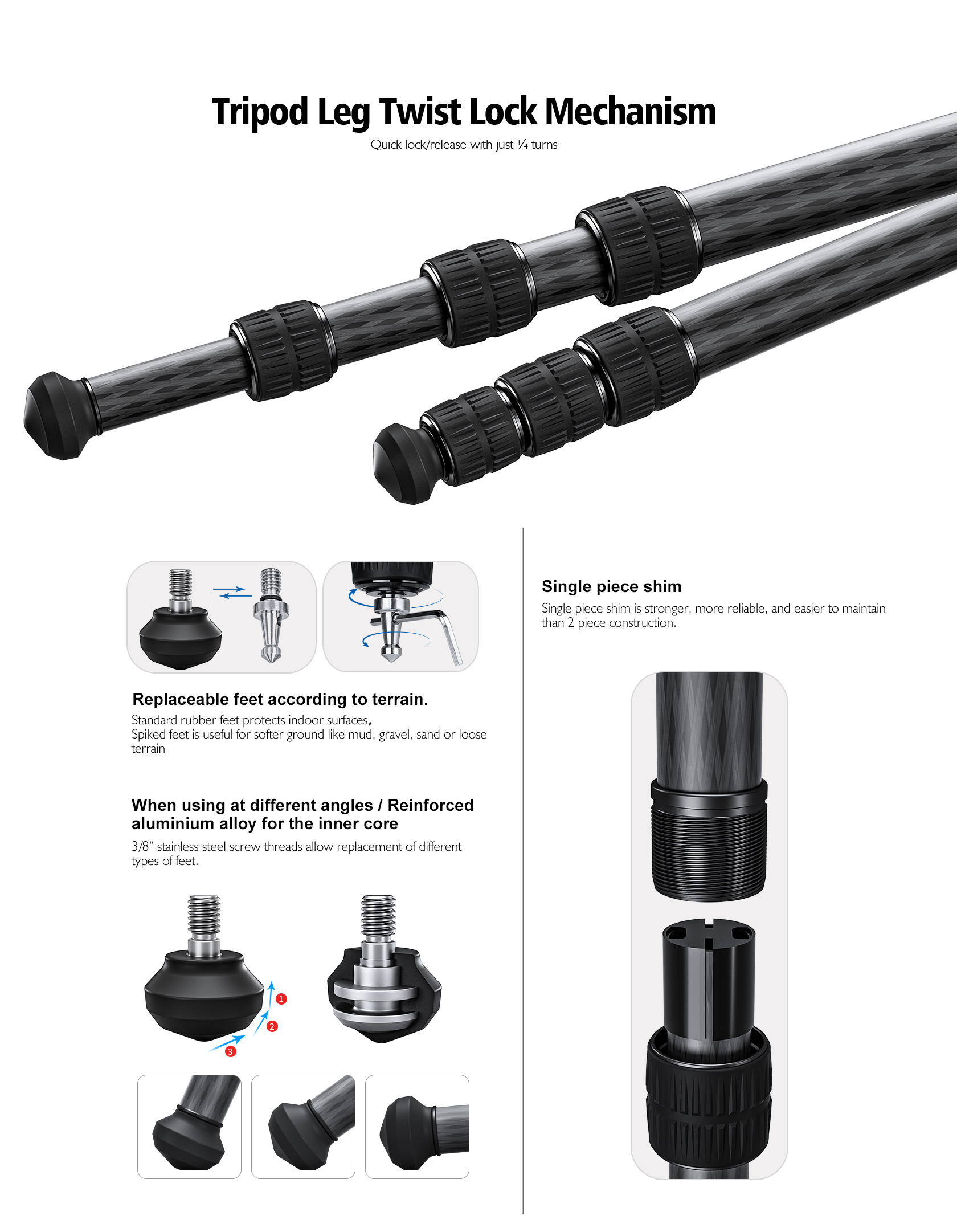 * Tripods must occasionally withstand tremendous bending and torsion loads. It is crucial that the leg angle stops and all other structural joints are well supported. Leofoto offset leg joints fully support the leg angle stops allowing loads to be transferred straight through the strongest members of the tripod. This also means the tripod is more compact when collapsed
