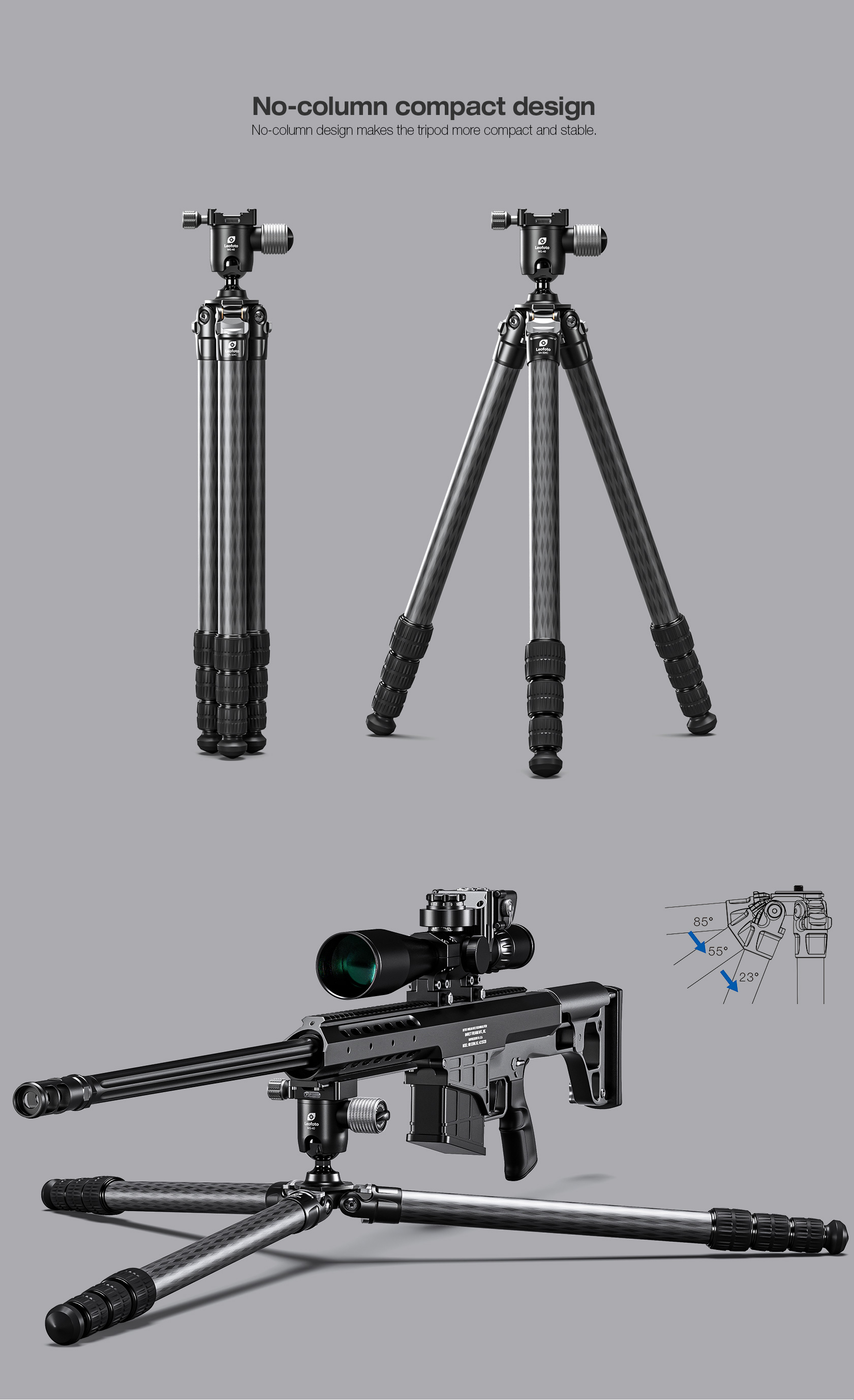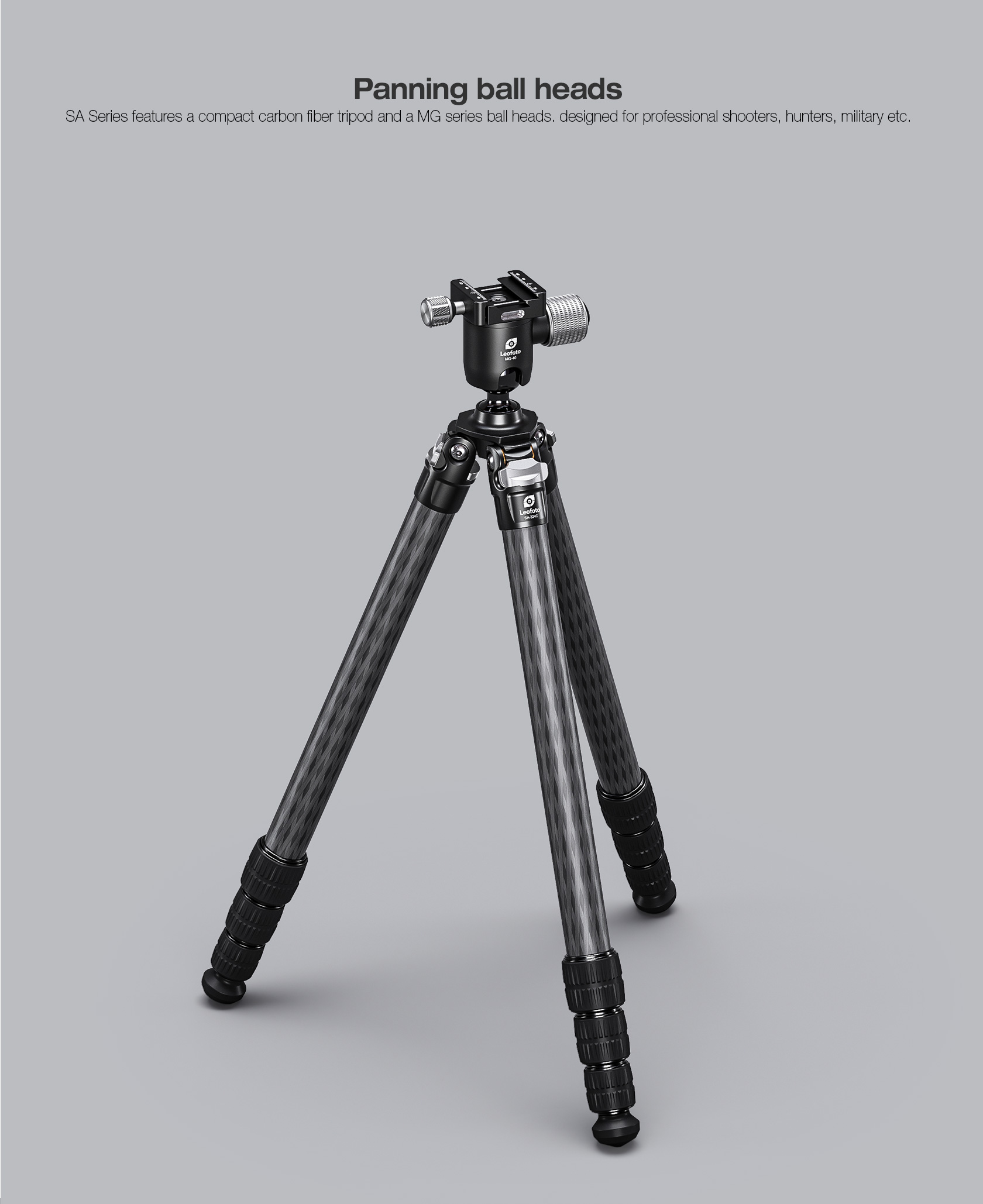 The Leofoto SA Series tripods are one of the most compact collapsed setups on the market with a perfectly balanced weight to strength ratio. The angle stop design has also been improved from the standard pull tab to a knurled bar which allows the user to adjust the angles with only one hand as opposed to two. The SA Series offers unparalleled versatility, built as a hunter’s companion who also enjoys long days on the range, but most requested by military, law enforcement, competitive shooters or those simply looking for one of the most compact and reliable shooting supports on the market. The SA Series tripods offer maximum rigidity, capable of supporting non-traditional shooting positions with a heavy load capacity. These tripods feature three angle stop positions to increase shooting capabilities and a compact design which maintains a small footprint, creating a tripod setup which is extremely easy to pack and carry on the go.