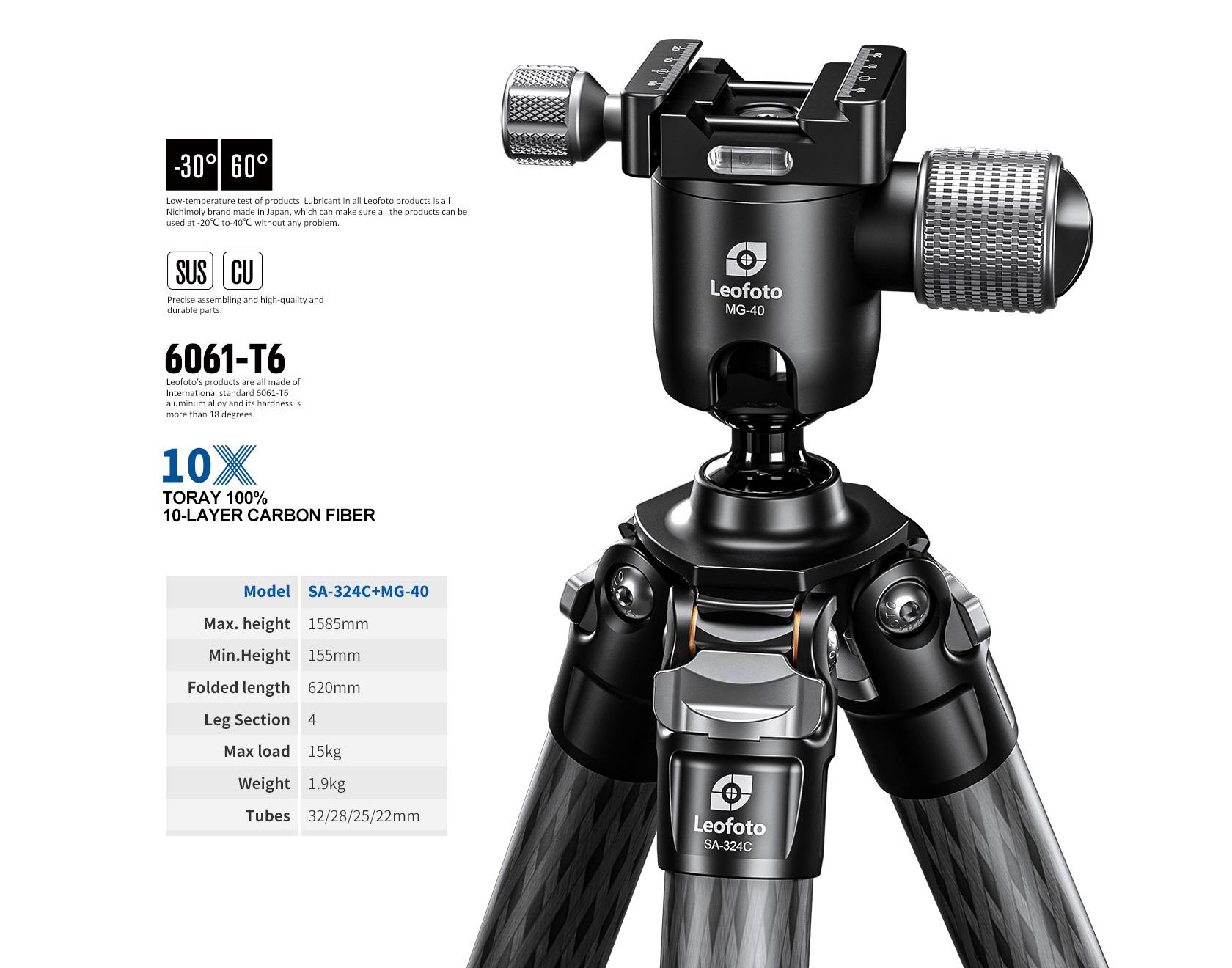 Leofoto SA-324C+MG-40 Professional carbon fiber Tripod