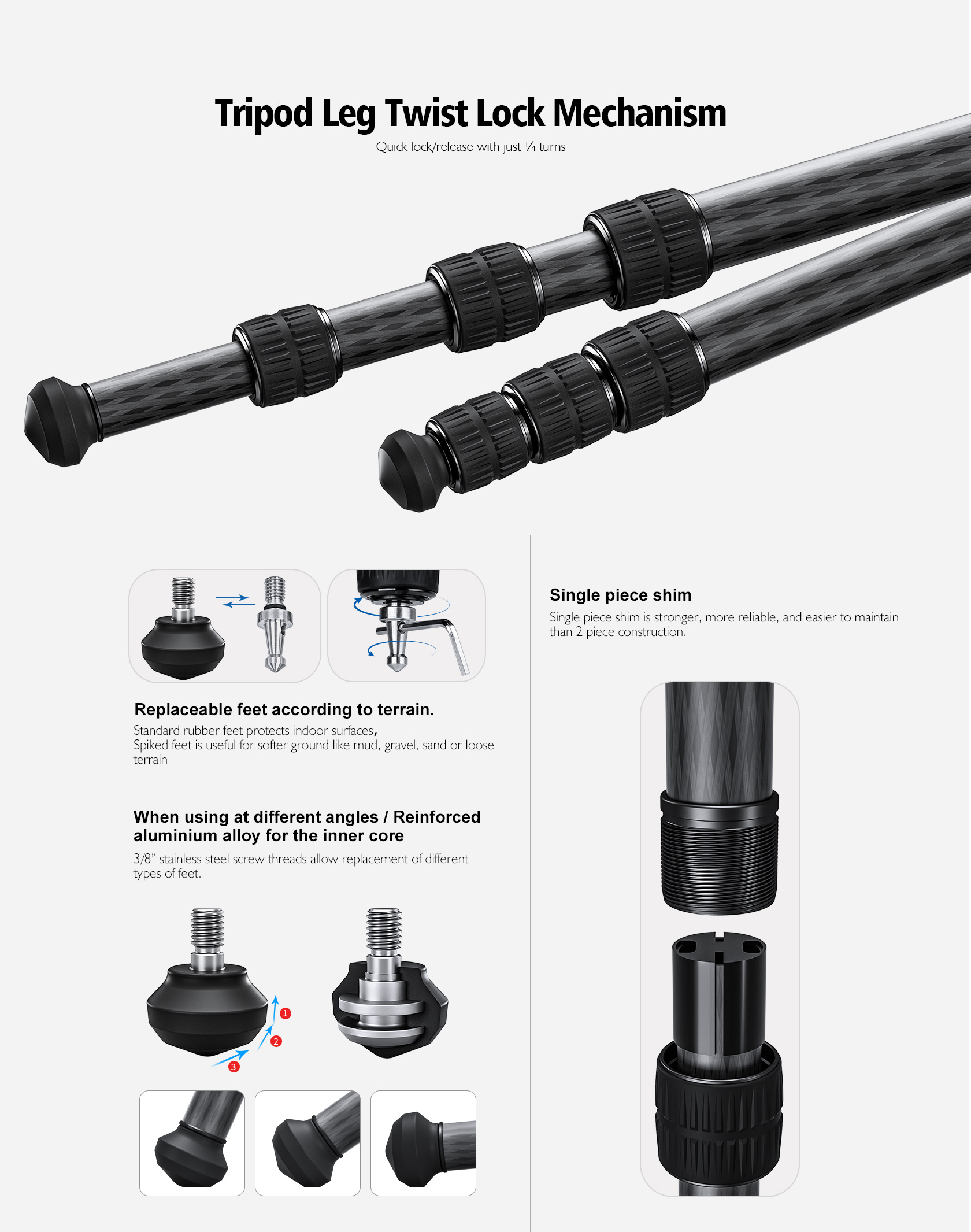 * Tripods must occasionally withstand tremendous bending and torsion loads. It is crucial that the leg angle stops and all other structural joints are well supported. Leofoto offset leg joints fully support the leg angle stops allowing loads to be transferred straight through the strongest members of the tripod. This also means the tripod is more compact when collapsed