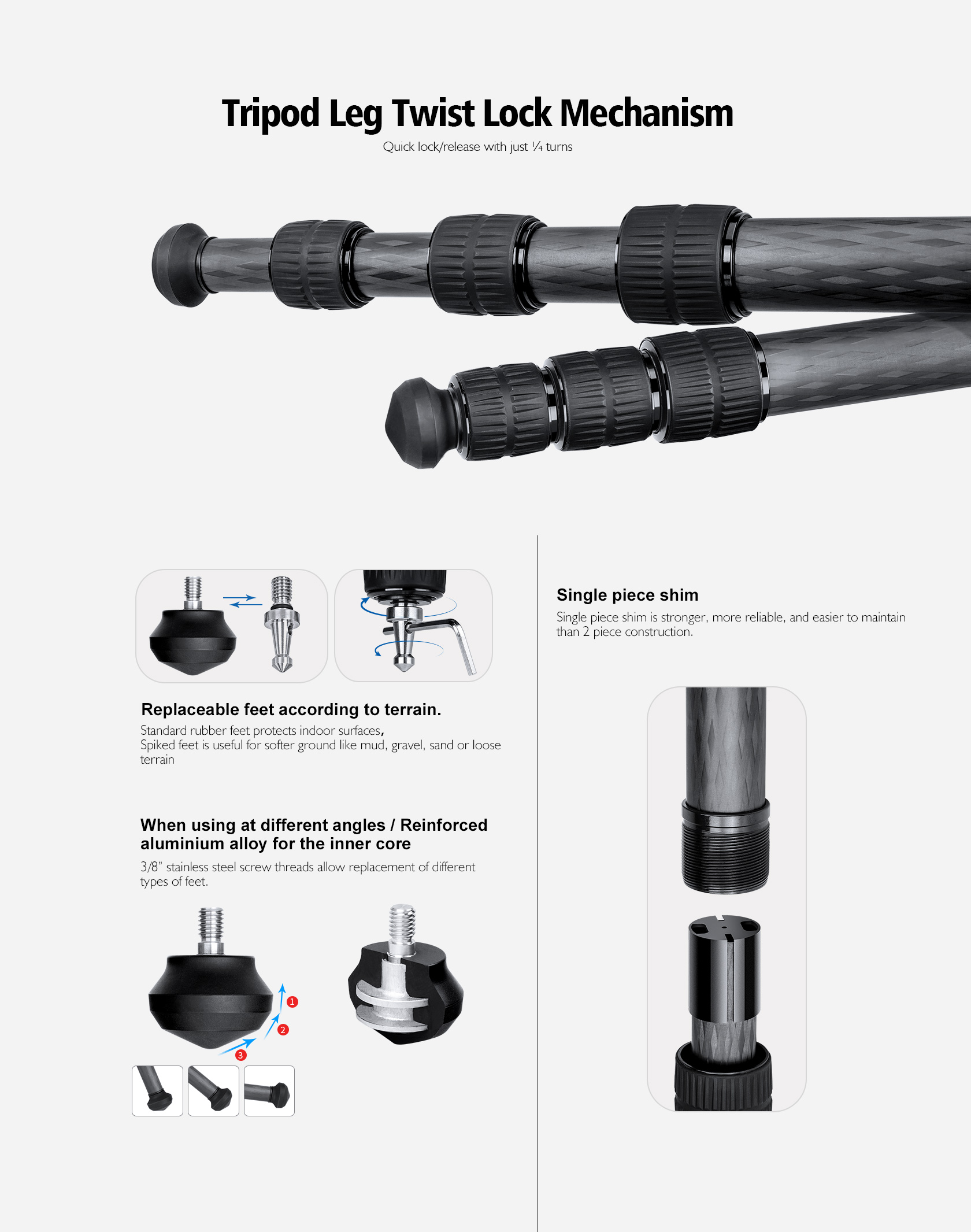 * Tripods must occasionally withstand tremendous bending and torsion loads. It is crucial that the leg angle stops and all other structural joints are well supported. Leofoto offset leg joints fully support the leg angle stops allowing loads to be transferred straight through the strongest members of the tripod. This also means the tripod is more compact when collapsed