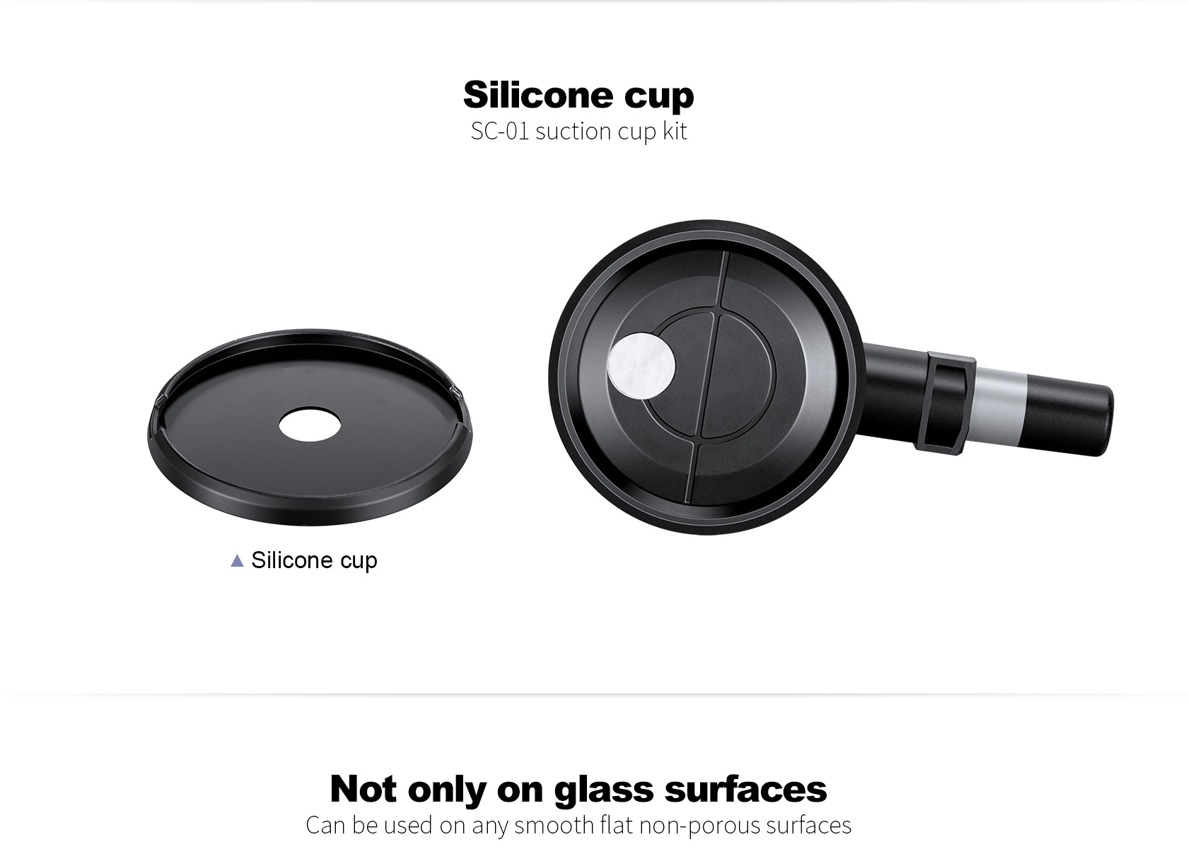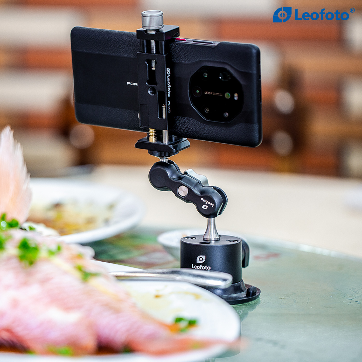 Mount a smartphone on a vehicle for motion shots with the Leofoto SC-01 Suction Cup Mounting Kit. The kit consists of a strong SC-01 suction cup, an articulating versa magic-arm, and a PC-90II smartphone clamp. The suction cup mounts onto a flat, clean, non-porous surface and supports up to a maximum 55lb load.