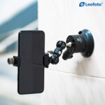 The Leofoto AM Series Versa Magic-Arm has a 1/4″-20 screw on one end and a 1/4″-20 thread on the other end. It mounts onto the suction cup and the smartphone clamp mounts onto the top of the arm.