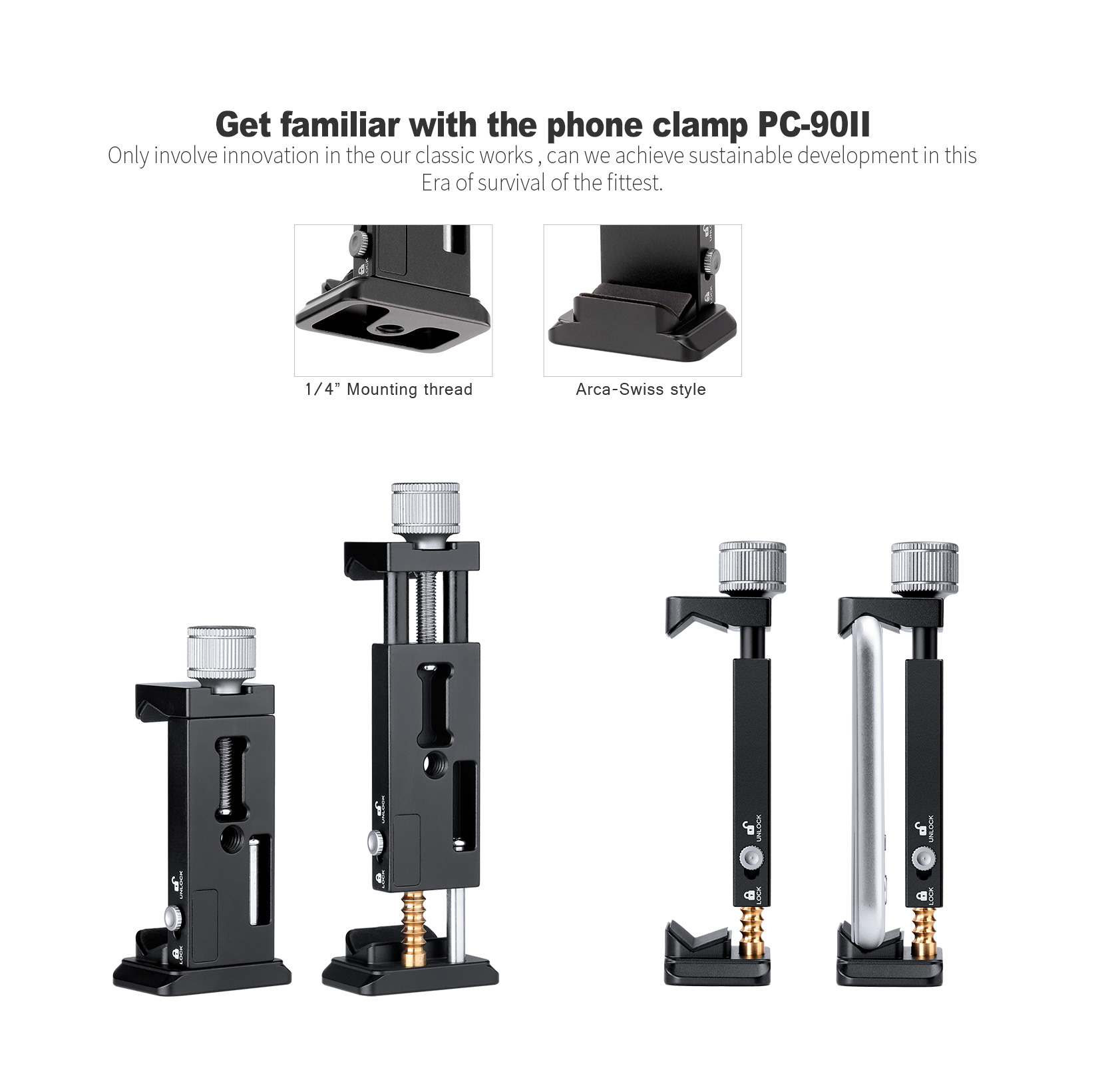 The Leofoto PC-90II is an adjustable smartphone clamp that allows you to securely mount your phone onto a tripod or other support system. The height of the phone clamp can be adjusted from 56-90mm / 2.2-3.5 inches, with a slider on the side that locks the height in place.