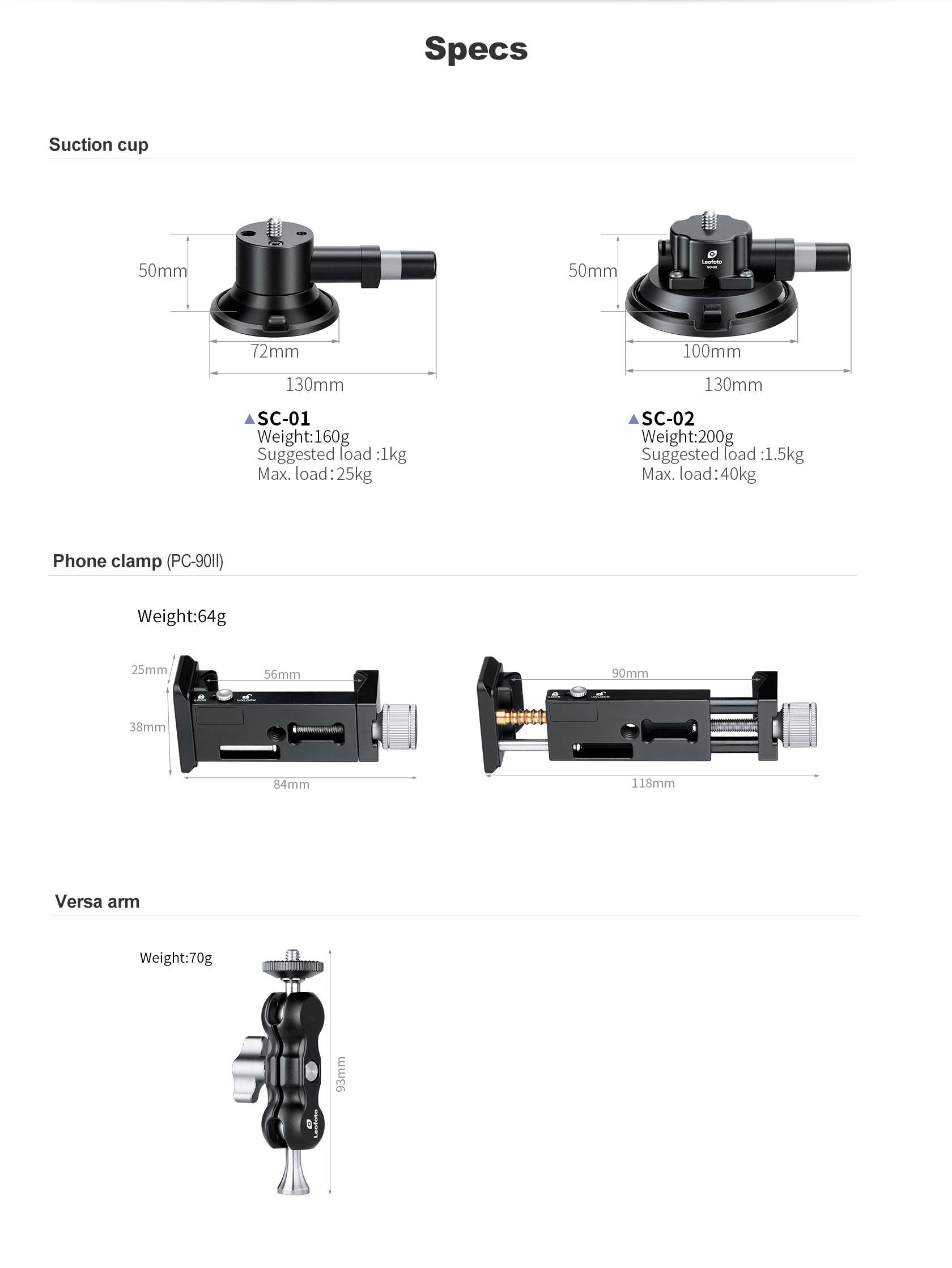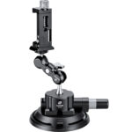 Mount a smartphone on a vehicle for motion shots with the Leofoto SC-02 Suction Cup Mounting Kit. The kit consists of a strong SC-02 suction cup, an articulating versa magic-arm, and a PC-90II smartphone clamp. The suction cup mounts onto a flat, clean, non-porous surface and supports up to a maximum 88lb load.