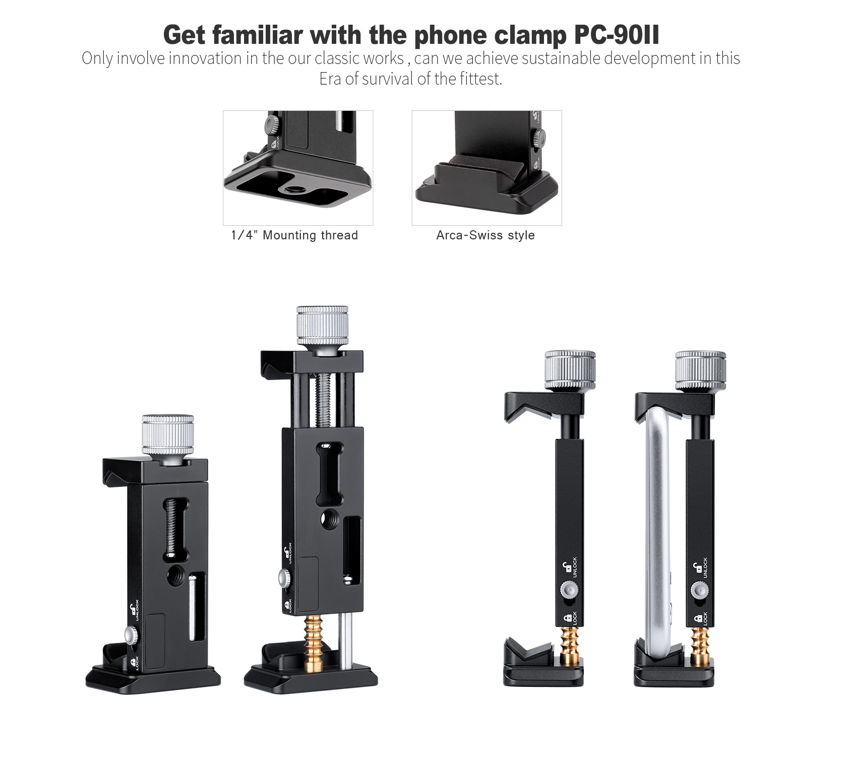 The Leofoto PC-90II is an adjustable smartphone clamp that allows you to securely mount your phone onto a tripod or other support system. The height of the phone clamp can be adjusted from 56-90mm / 2.2-3.5 inches, with a slider on the side that locks the height in place.