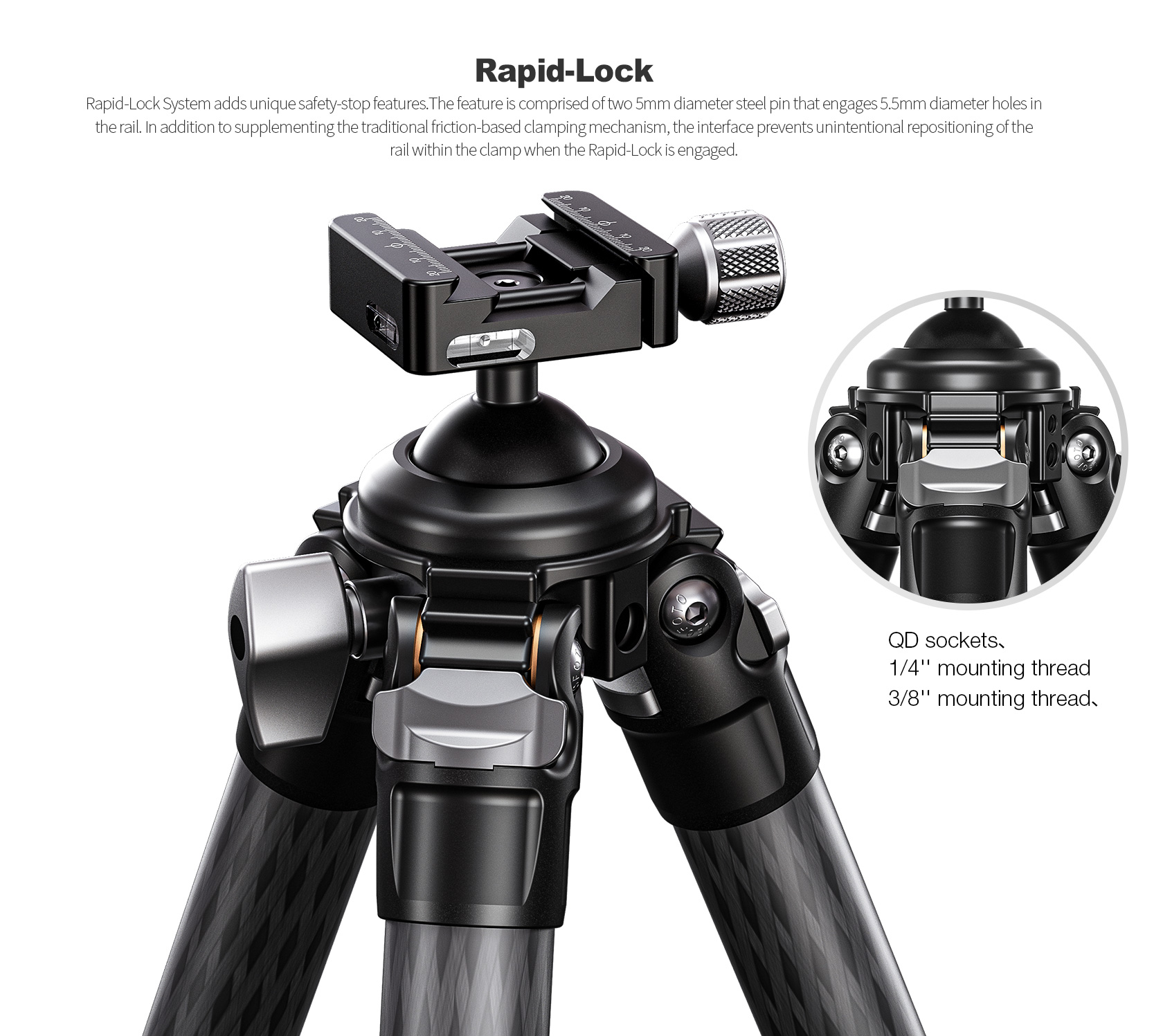 * Integrated knob control ballhead with lever-release clamp for speed