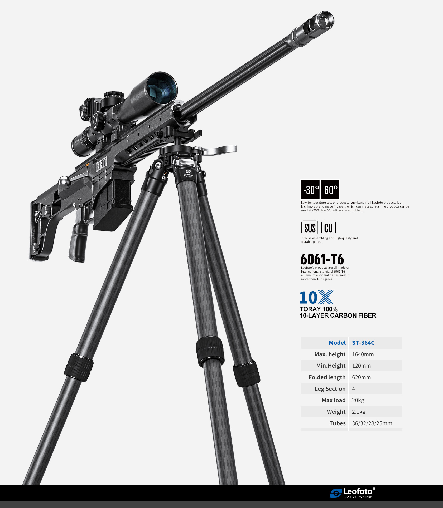 The Leofoto ST Series Rifle Tripods are one of the most compact apex setups on the market with a perfectly balanced weight to strength ratio. The ST Series features a knob-controlled clamp, with the option to choose either a dual Arca & Picatinny clamp or an Arca-only clamp, along with a knob-controlled, integrated ball head. These tripods provide maximum rigidity, making them ideal for supporting non-traditional shooting positions. They also feature three angle stop positions to increase shooting position capabilities and a compact design which maintains a small footprint, creating a tripod setup which is extremely easy to pack and carry on the go.