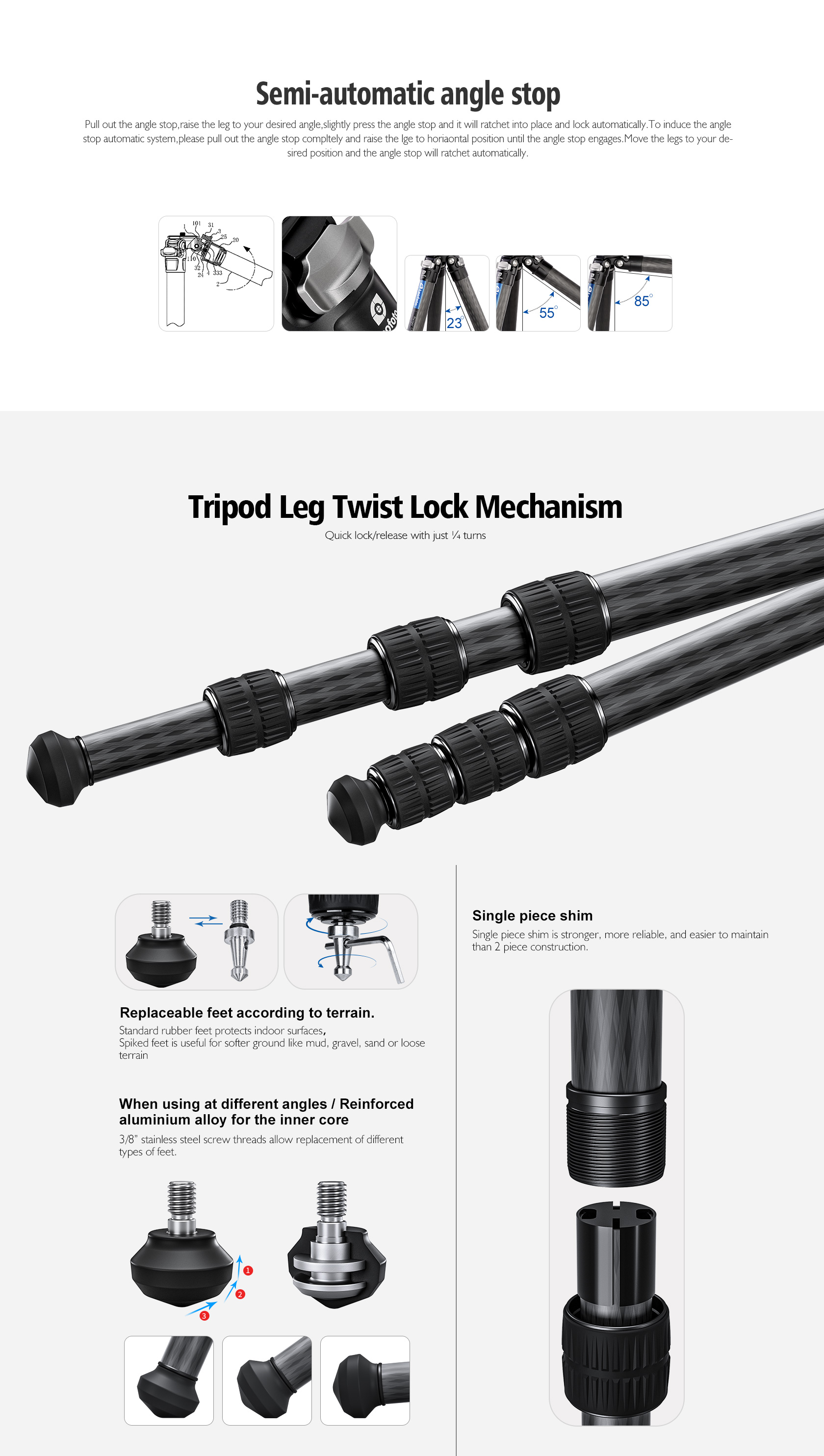 * InTripods must occasionally withstand tremendous bending and torsion loads. It is crucial that the leg angle stops and all other structural joints are well supported. Leofoto offset leg joints fully support the leg angle stops allowing loads to be transferred straight through the strongest members of the tripod. This also means the tripod is more compact when collapsed