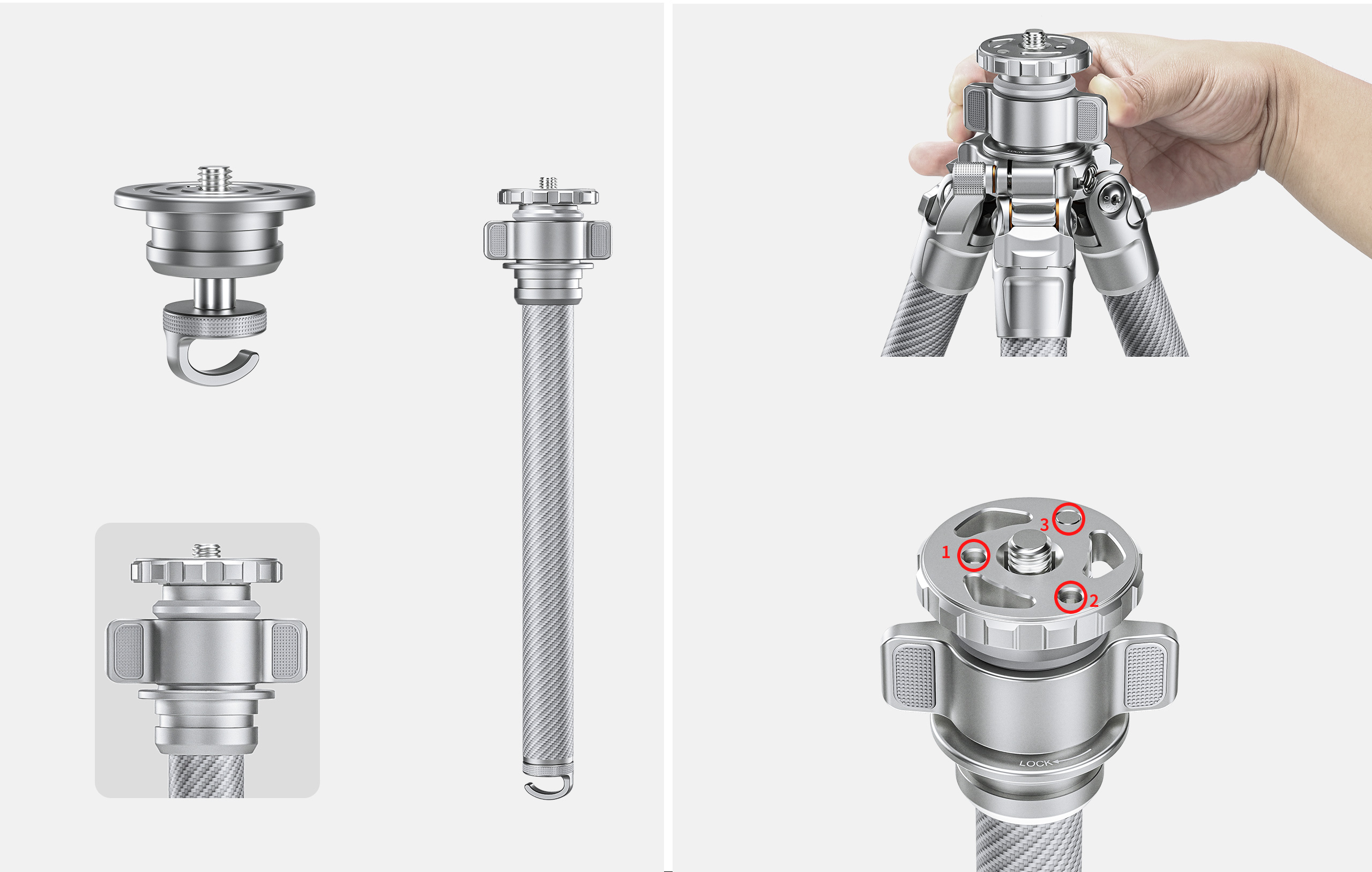 On the center column, there are 2 Allen screws (#1,2) to prevent the mounting base from twisting and 1 Allen screw (#3) to prevent the ballhead from twisting