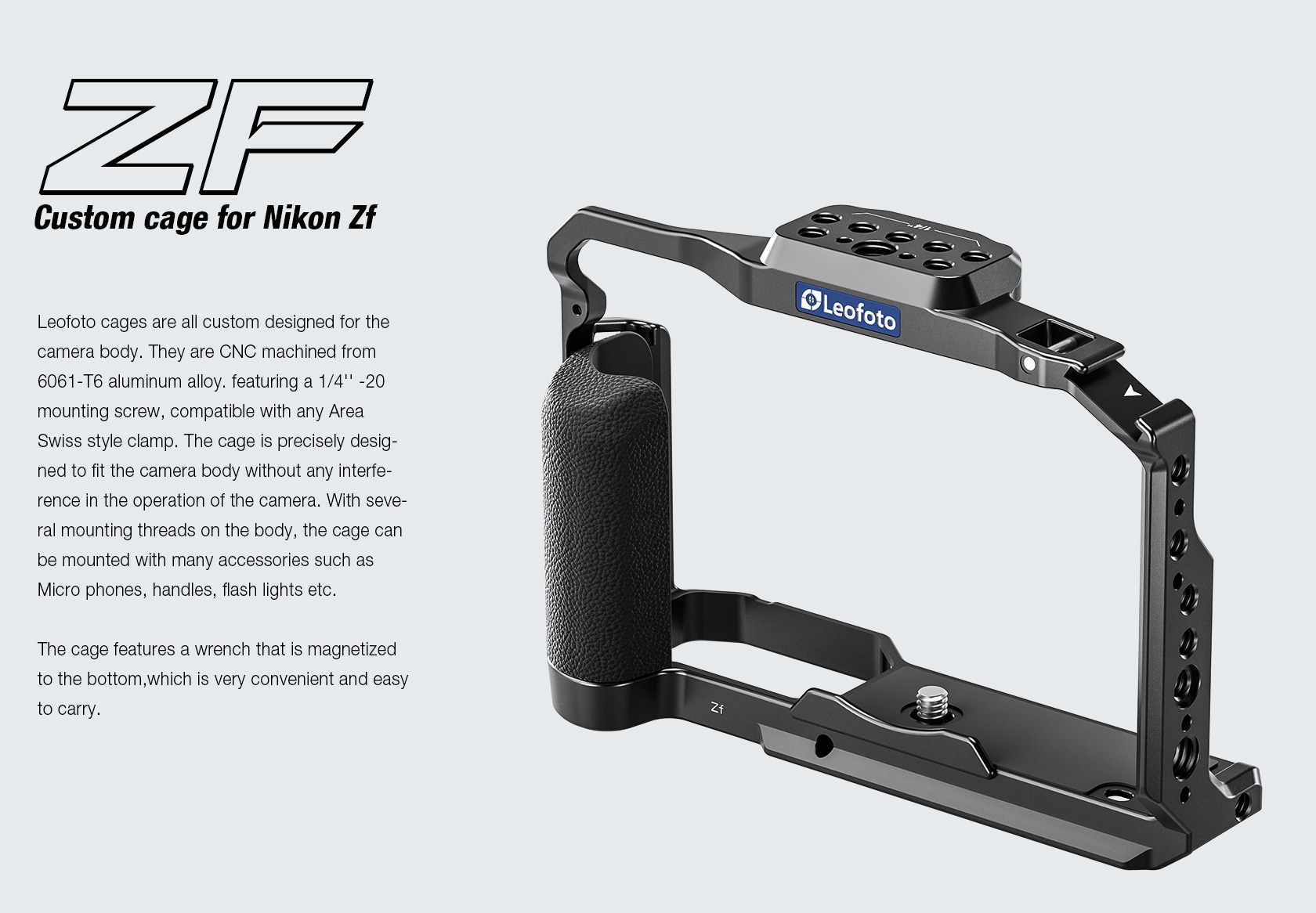 Protect and add accessories to your Nikon Zf camera with this Leofoto Zf Camera Cage. The form-fitting aluminum cage protects your camera without impeding access to your camera’s functions, displays, ports, or battery. The camera mounts on the cage via a 1/4″-20 stud screw, and the mounting surface features anti-slip pads that help hold your camera securely in the cage.