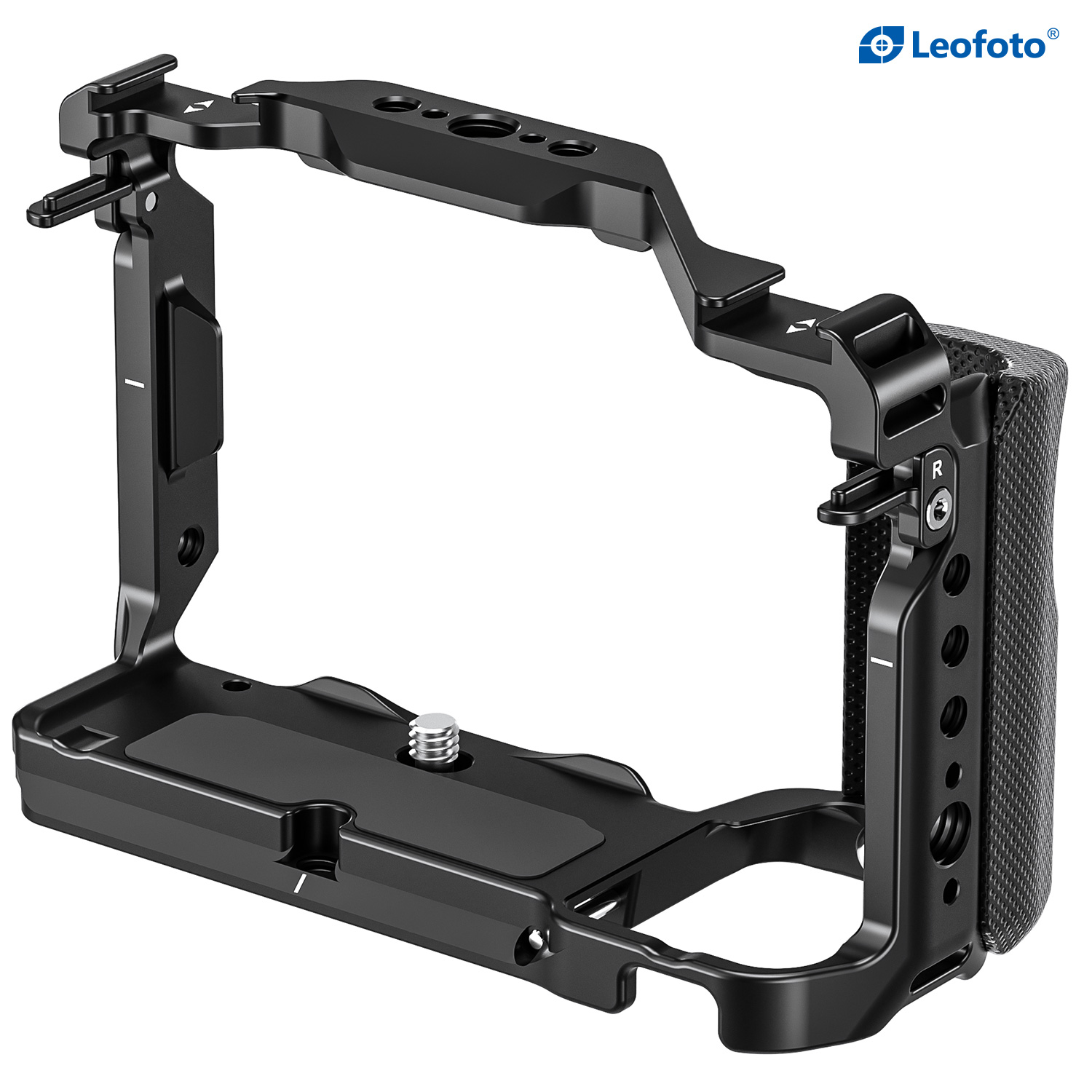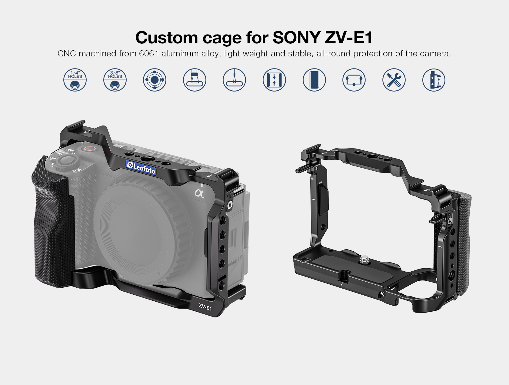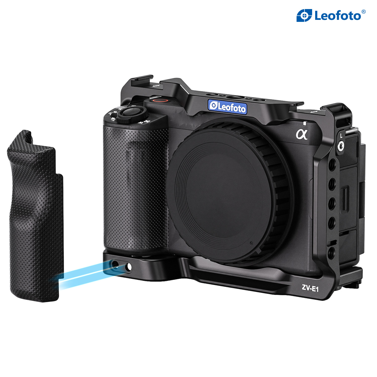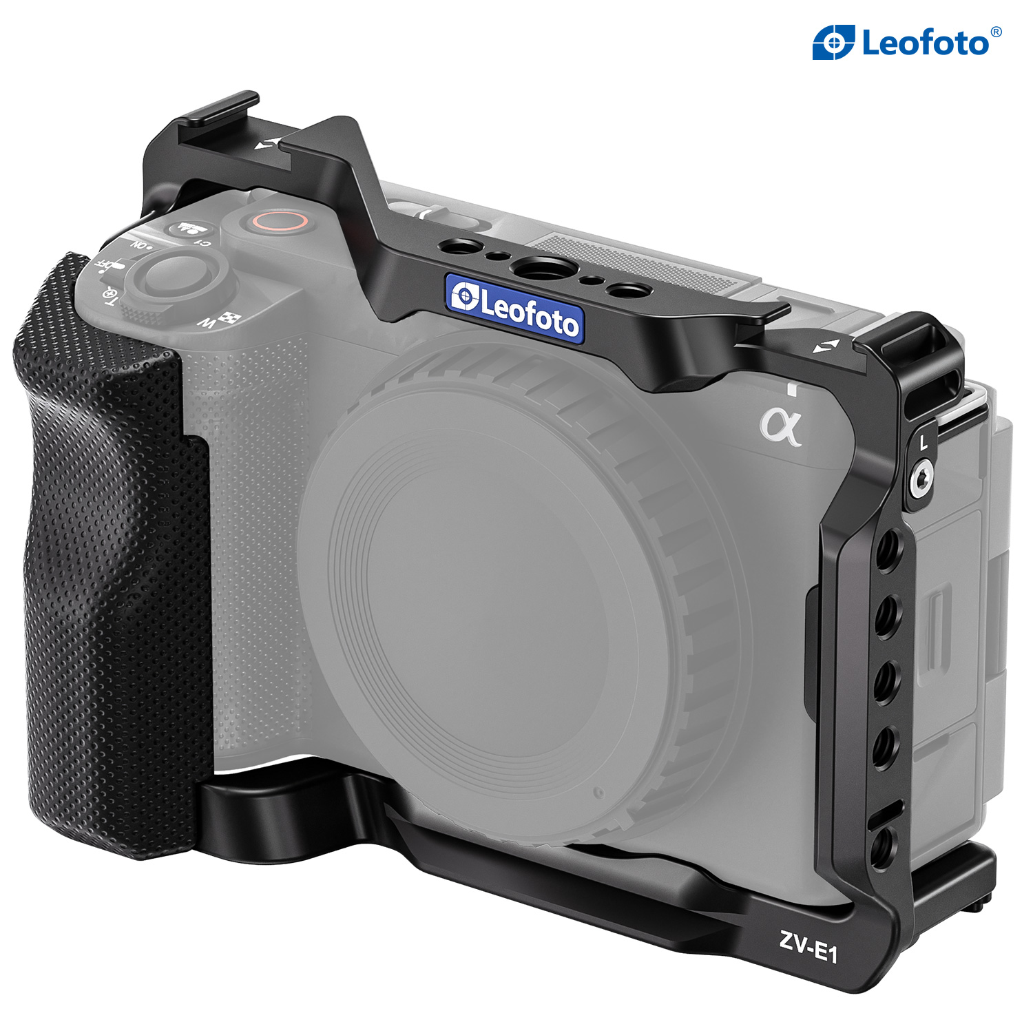 Protect your Sony ZV-E1 from the rigors of the production day while also providing multiple accessory mounting points that won’t stress your camera’s body with this form-fitting Leofoto ZV-E1 Custom Cage for Sony ZV-E1 Camera. The cage features one cold shoe mount on top of the cage and one on the side, as well as multiple 1/4″-20 and 3/8″-16 threaded accessory-mounting holes. The 3/8″-16 threaded holes feature anti-twist divots.