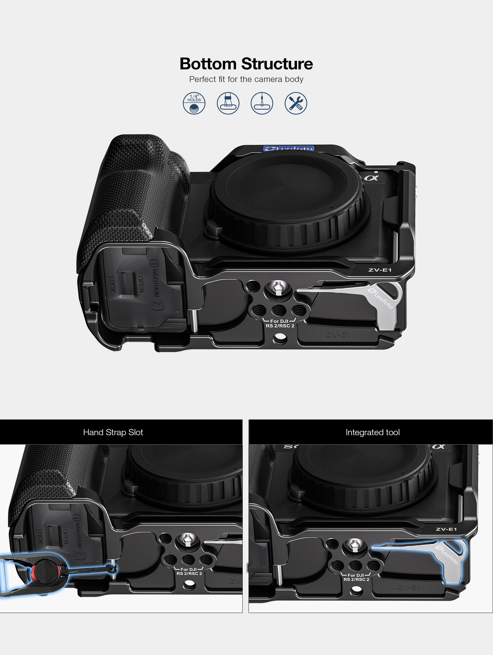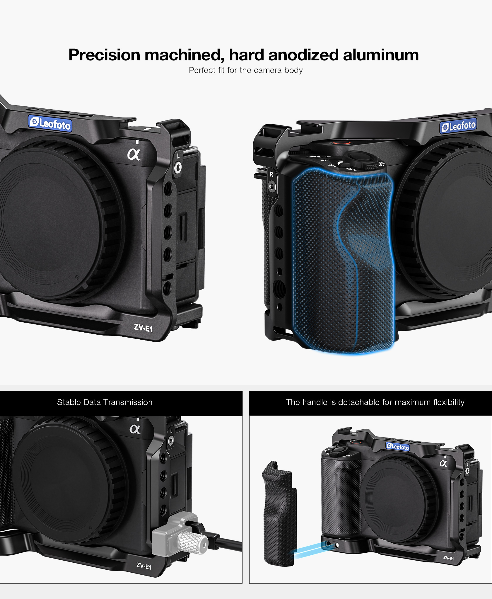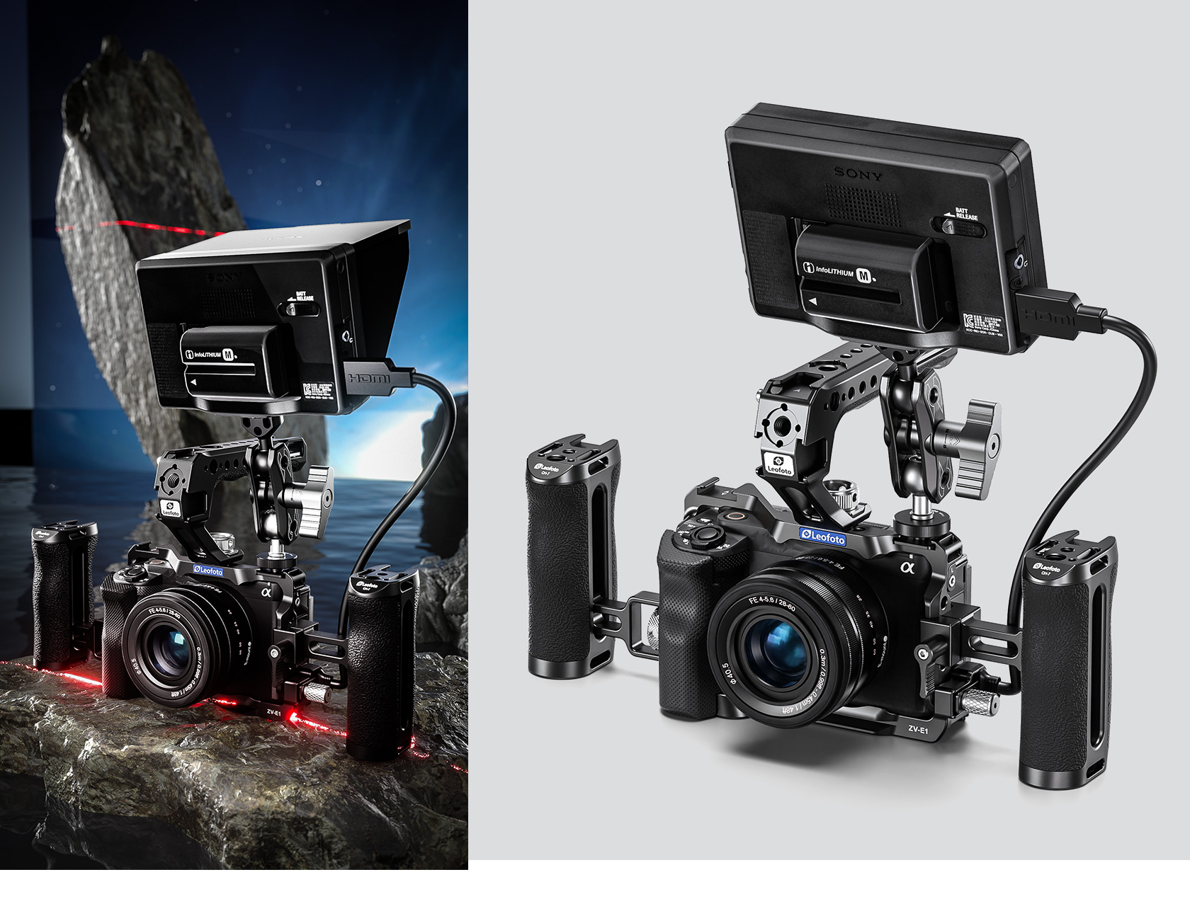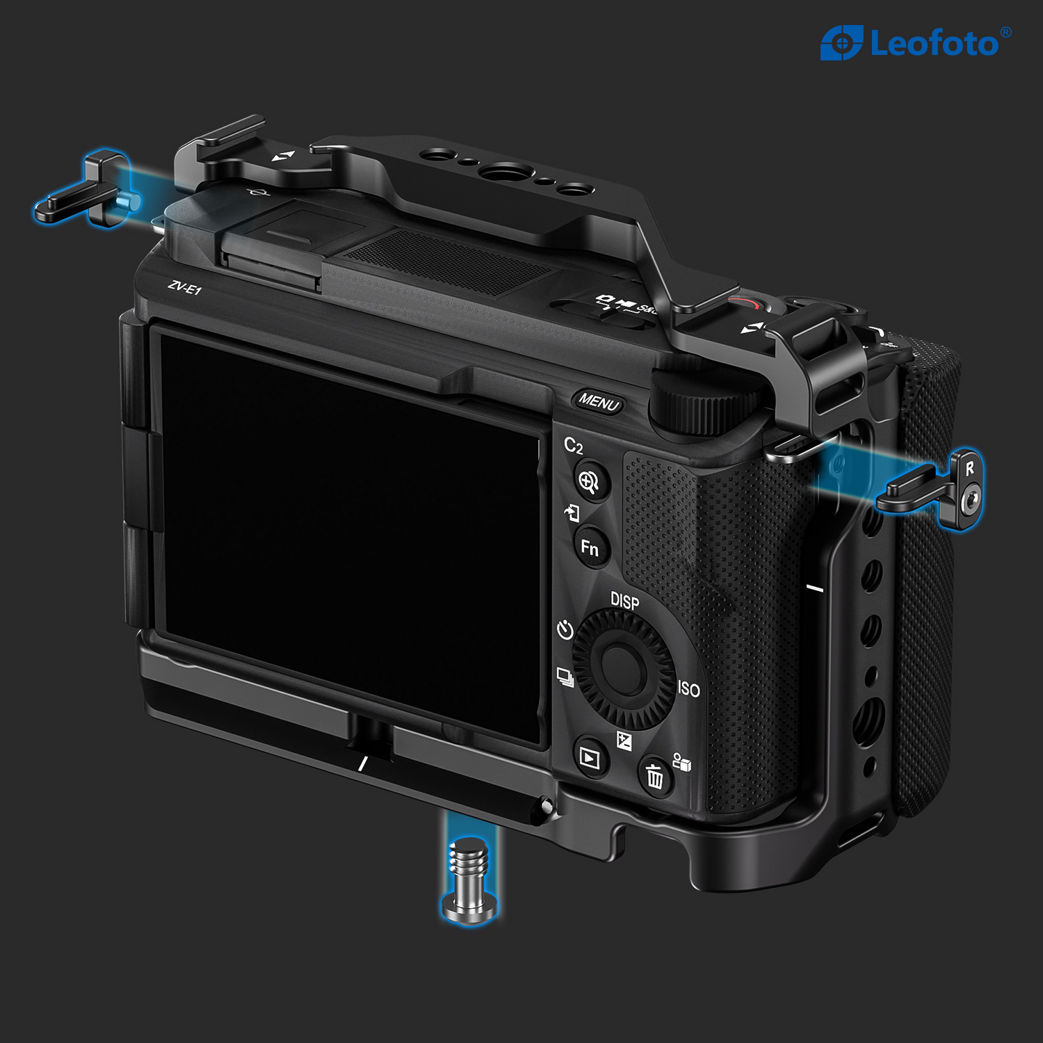 Protect your Sony ZV-E1 from the rigors of the production day while also providing multiple accessory mounting points that won’t stress your camera’s body with this form-fitting Leofoto ZV-E1 Custom Cage for Sony ZV-E1 Camera. The cage features one cold shoe mount on top of the cage and one on the side, as well as multiple 1/4″-20 and 3/8″-16 threaded accessory-mounting holes. The 3/8″-16 threaded holes feature anti-twist divots.