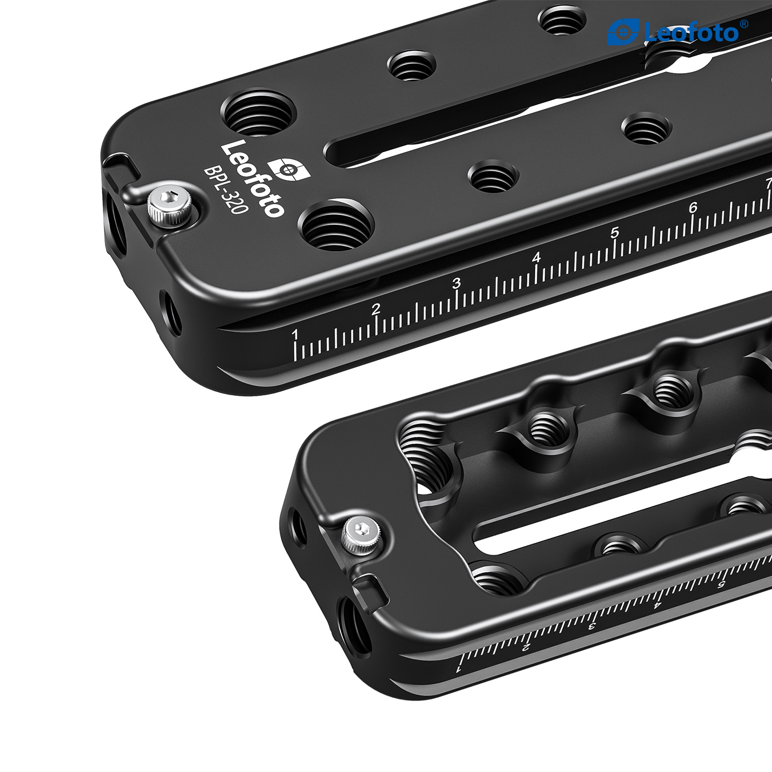 BPL-320 Double Arca Long Rail (320mm / 12.59in)This rail features an Arca profile on the bottom and top of the rail, which allows for multiple mounting options at any position. The bottom profile enables the rail to be moved to any position in an Arca clamp, accommodating a variety of installed equipment. A large top-mounted bubble level allows for quick and easy leveling of the rail for level panning and accurate measurements.