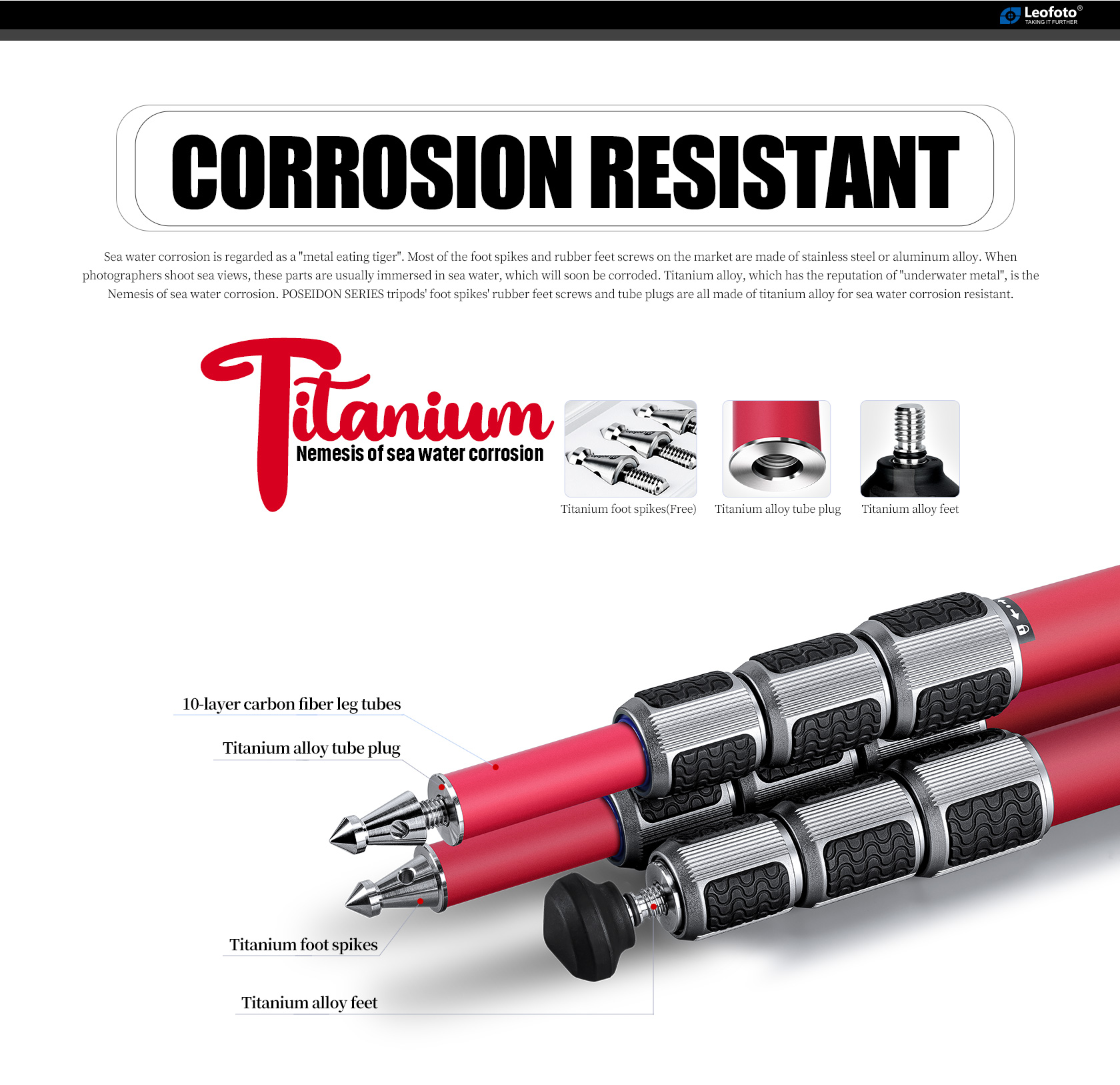 The Athena Ocean Tripod. It is designed for use in harsh, wet environments. Made with 10-layer carbon fiber leg tubes and titanium components, it provides excellent corrosion resistance and makes it suitable for use in a variety of conditions. The tripod also features twist-lock joints that repel water, sand, and debris, which helps to minimize the need for maintenance. The LA series tripod features a fixed, compact apex.